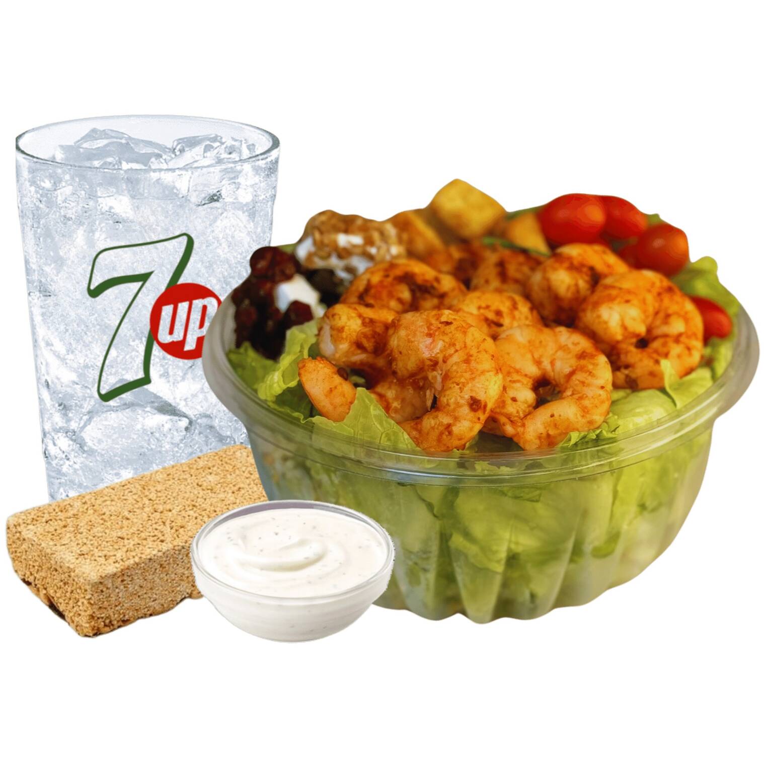 Camarones con Salsa BBQ acompañados de Papas a la Francesa, Ensalada César, Galletas Saladas con Bebida y Postre a Elegir.
