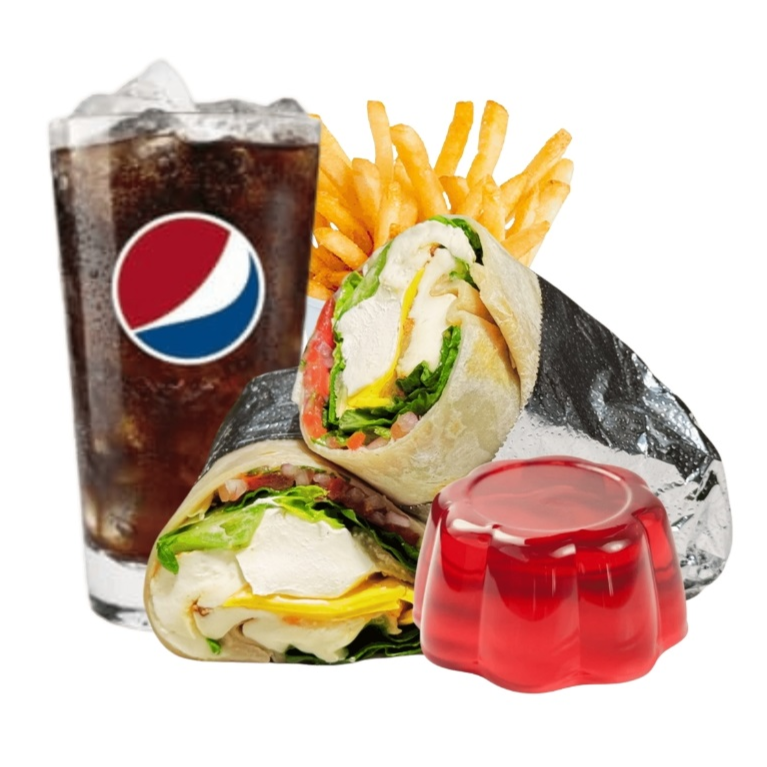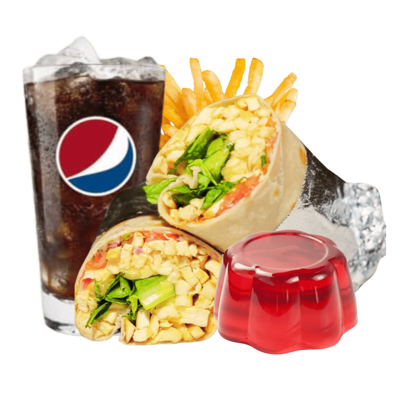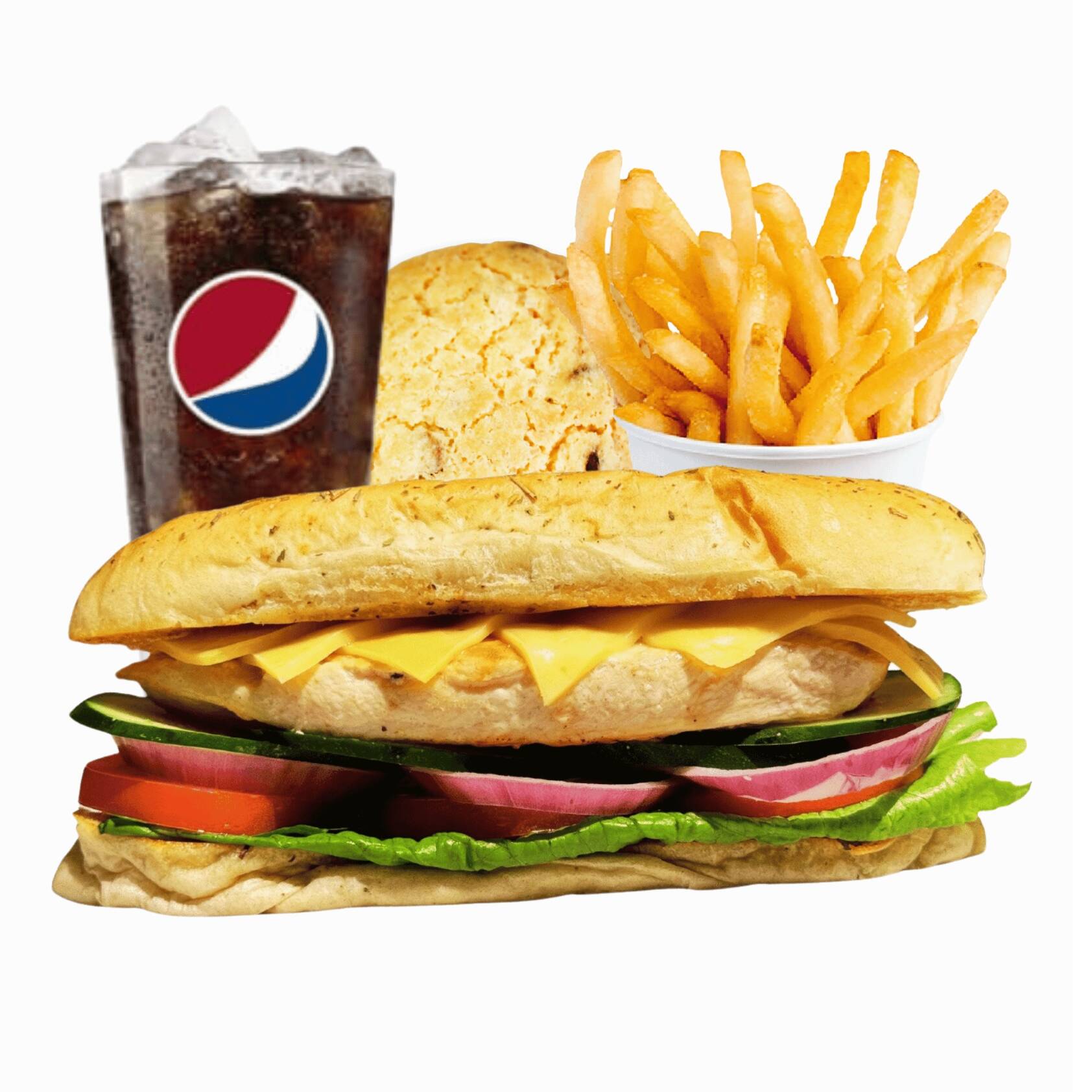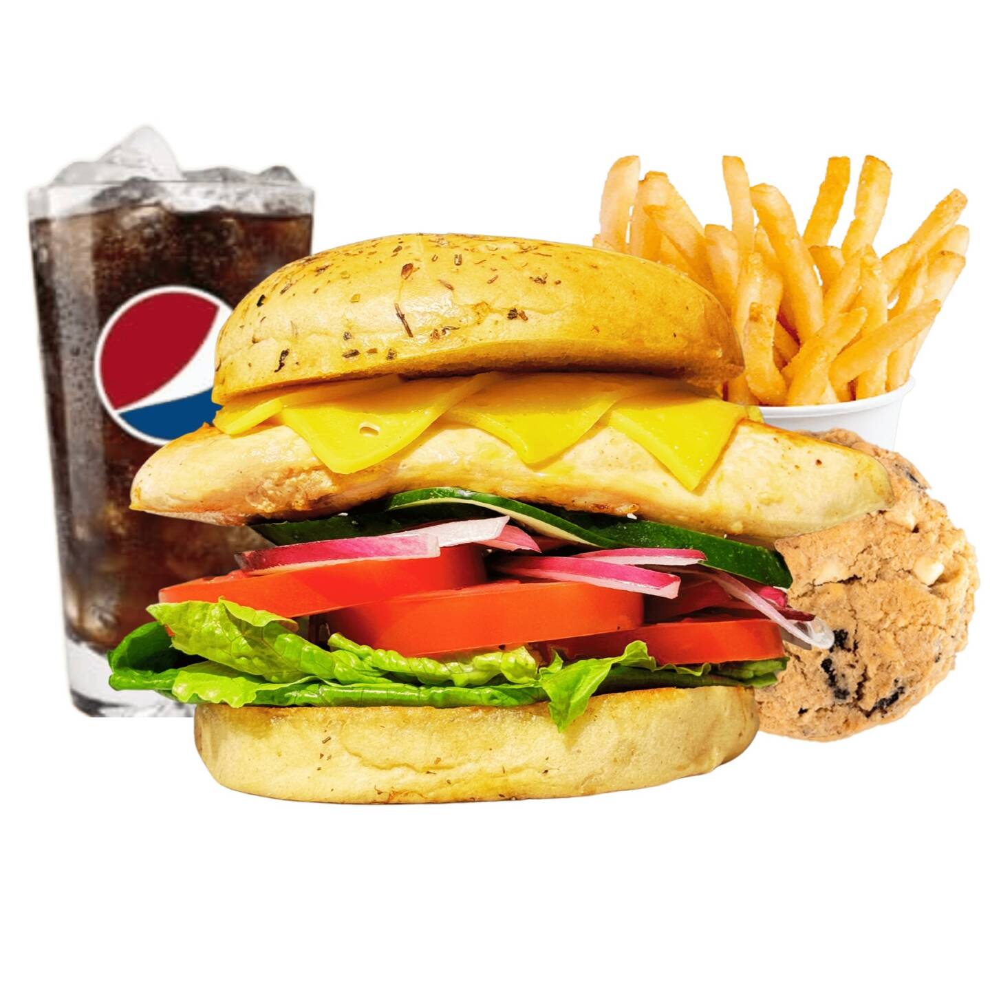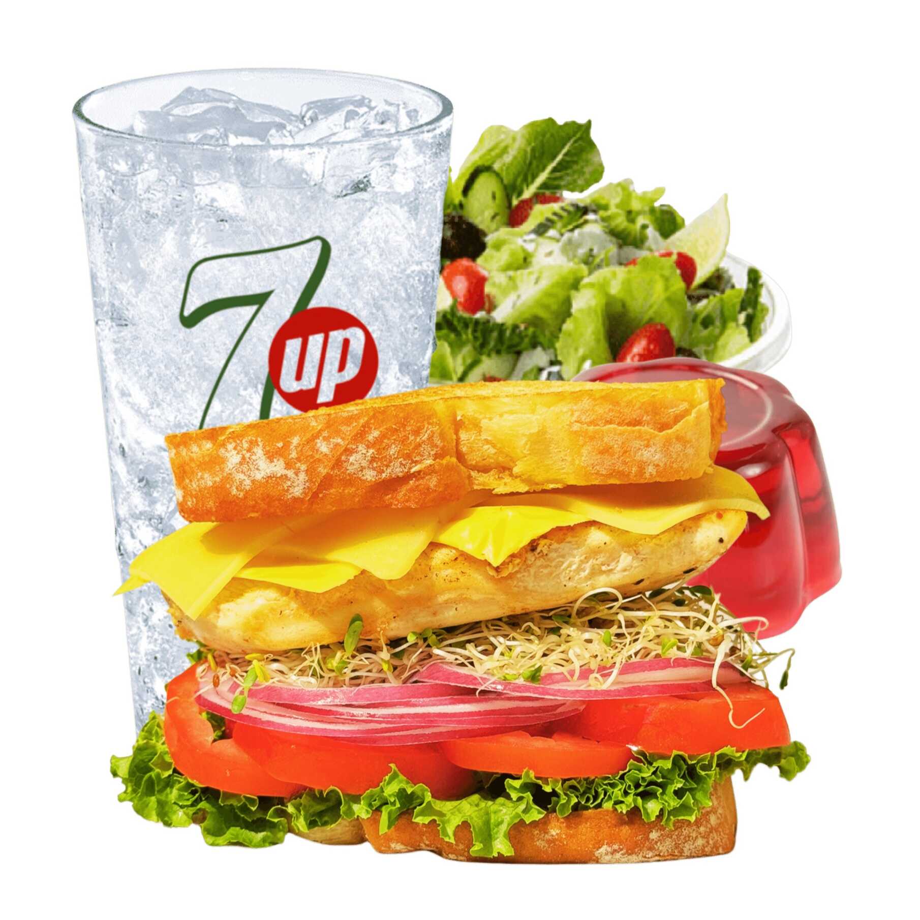 Sandwich de Pan Artesanal con Pechuga de Pollo a la Plancha, Queso Manchego, Lechuga, Jitomate, Cebolla y Germinado de Alfalfa acompañado Papas a la Francesa, Catsup, Jalapeños, Postre y Bebida a Elegir.