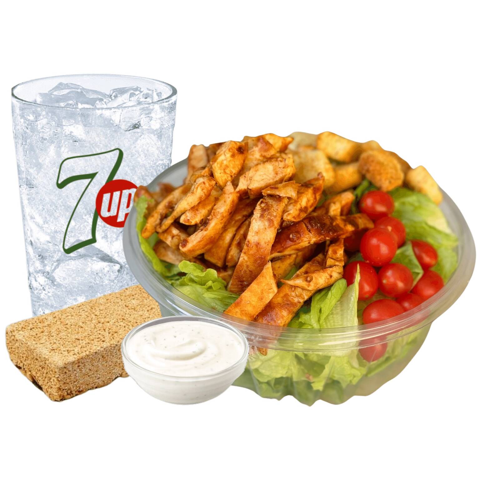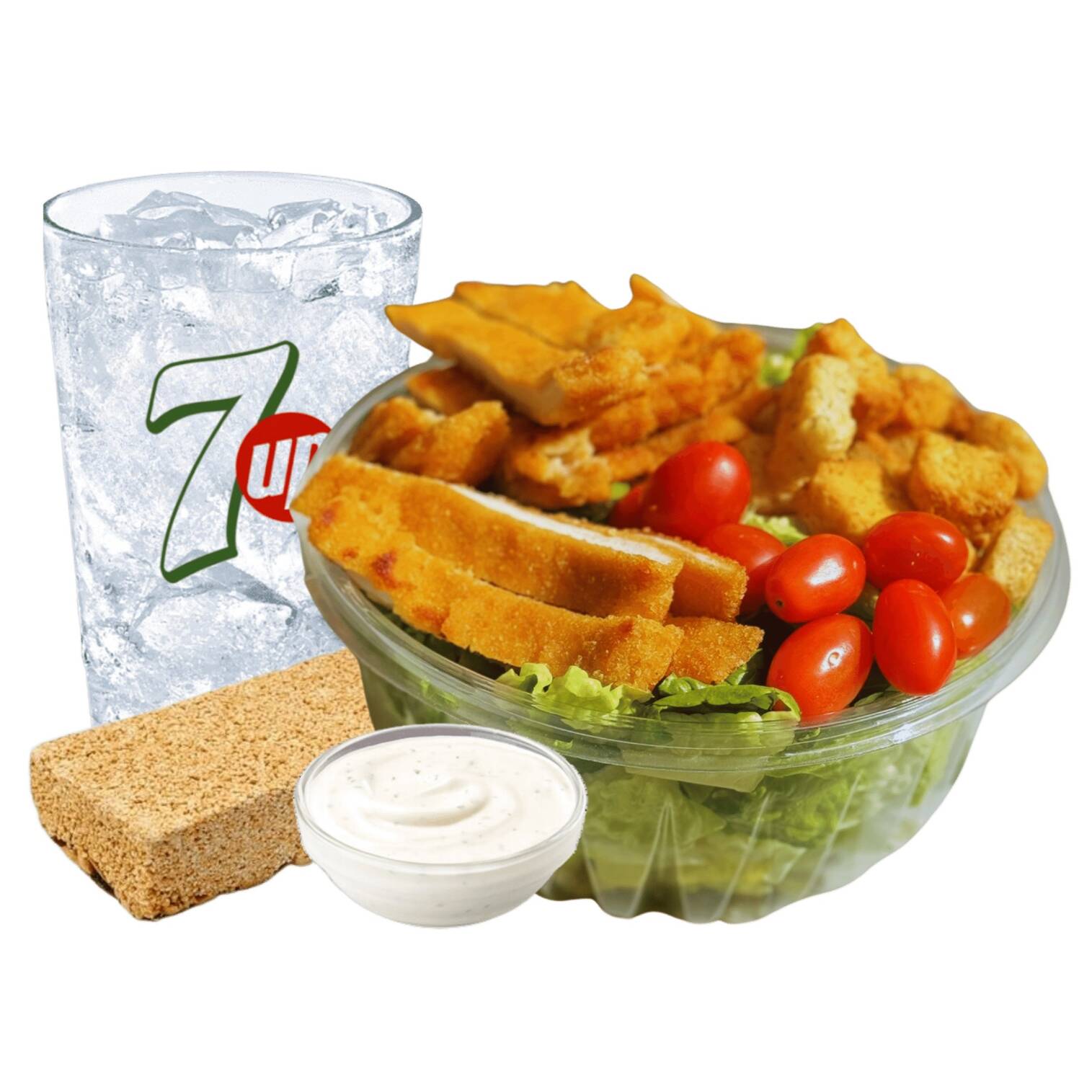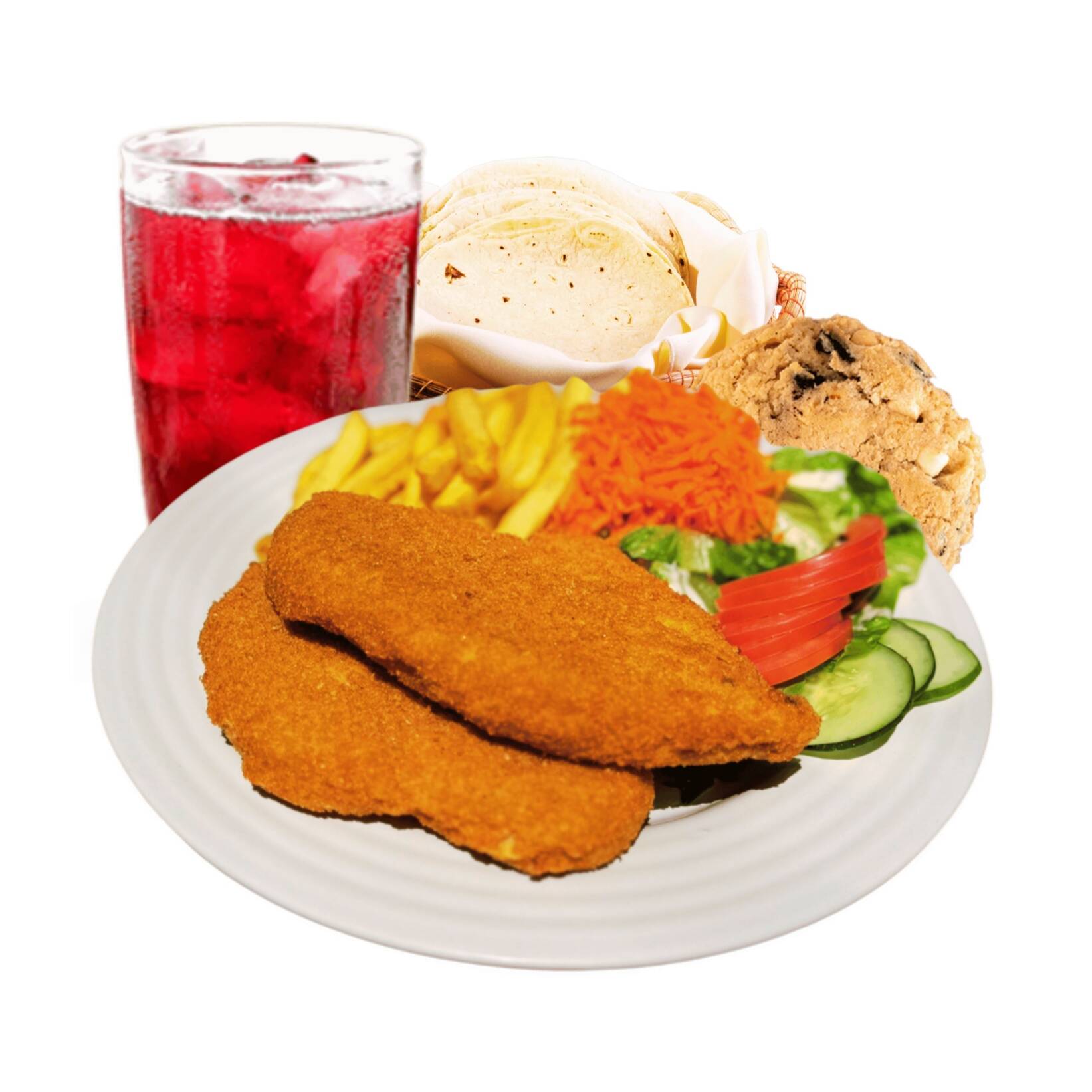 Pechuga de Pollo con Empanizado Crujiente acompañado de Papas a la Francesa y Ensalada César, Bebida y Postre a Elegir.