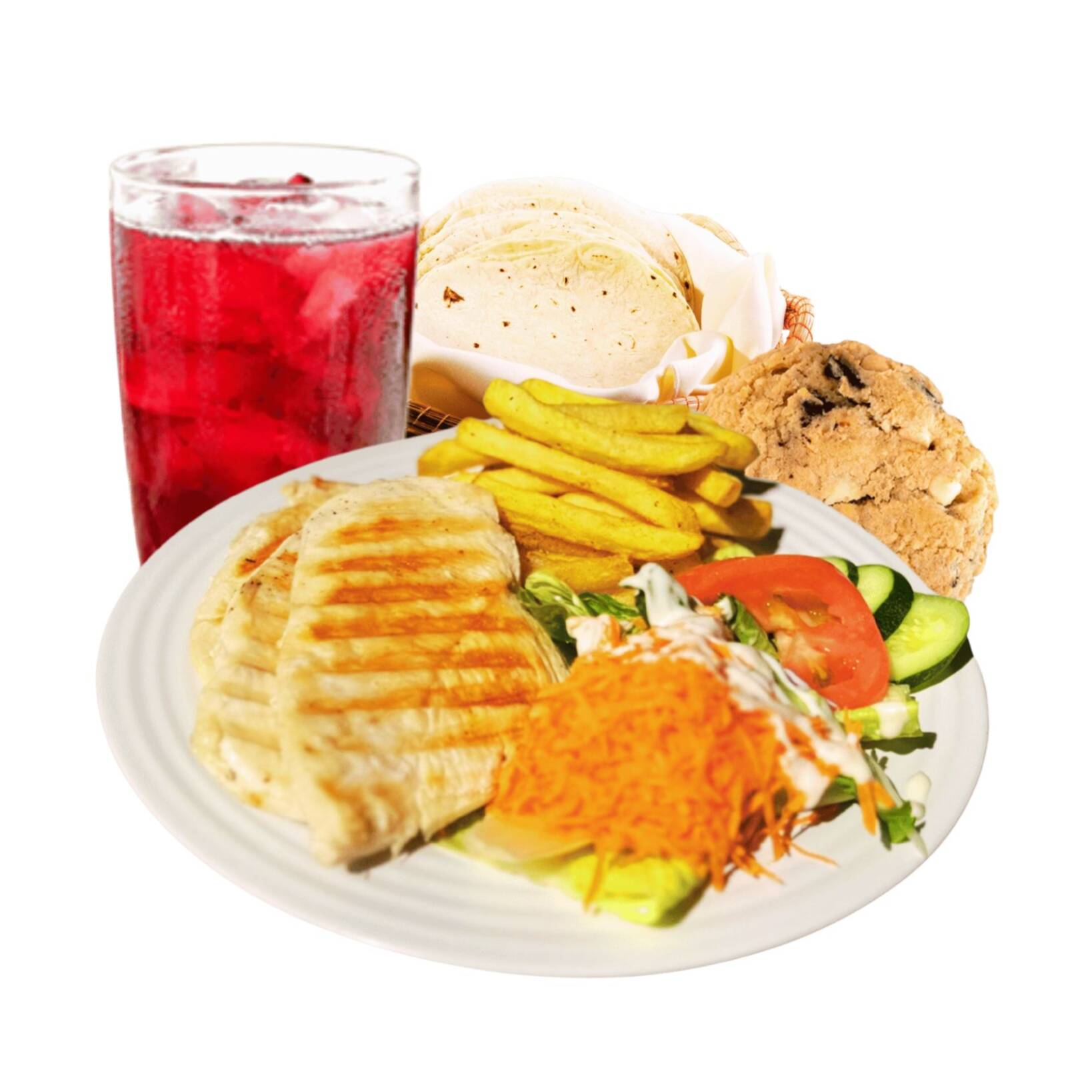 Panini de Pan Artesanal con Pechuga de Pollo a la Plancha y Queso Manchego, Lechuga, Jitomate, Cebolla, Pepino acompañado de Papas a la Francesa, Catsup, Jalapeños, Bebida y Postre a Elegir.