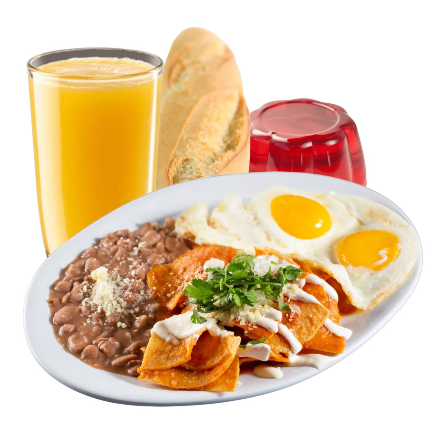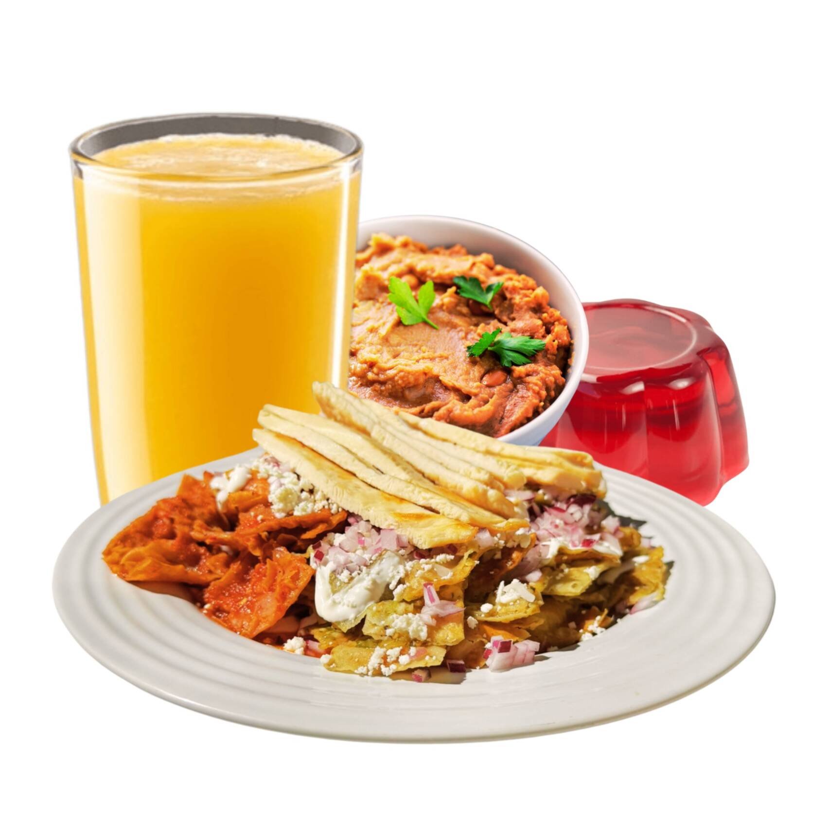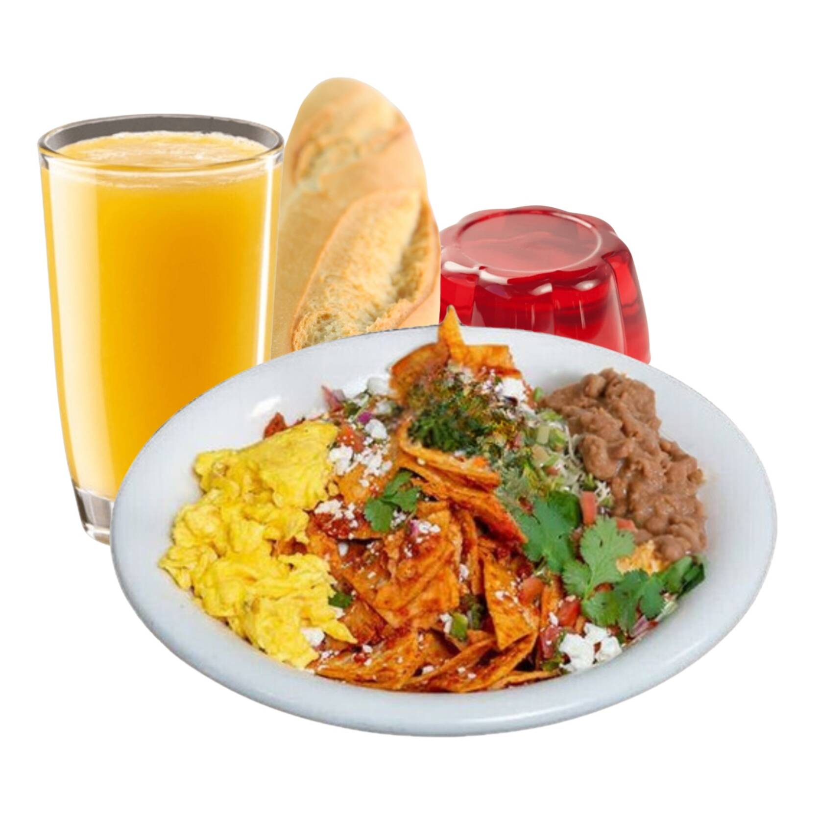 Chilaquiles Rojos con Pechuga de Pollo acompañados de Huevo Revuelto, Frijoles Fritos, Bolillo, Salsa de Tomate, Bebida y Postre a Elegir.
