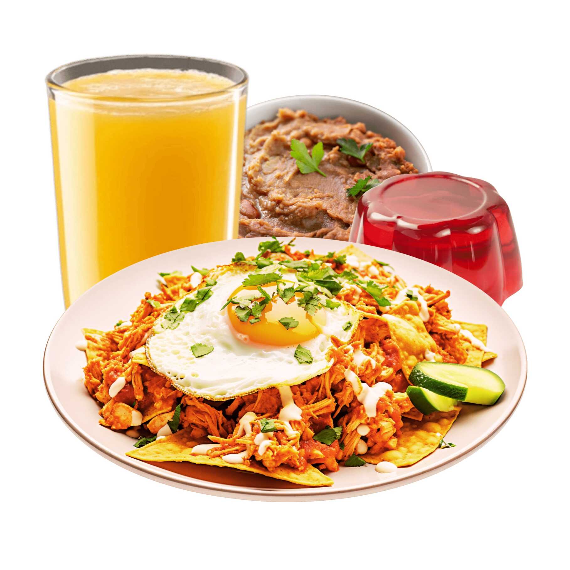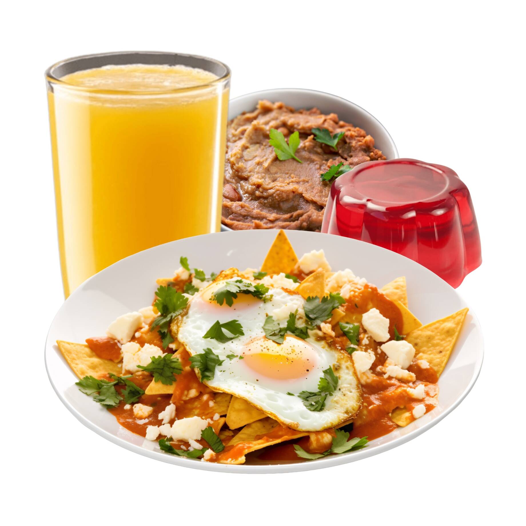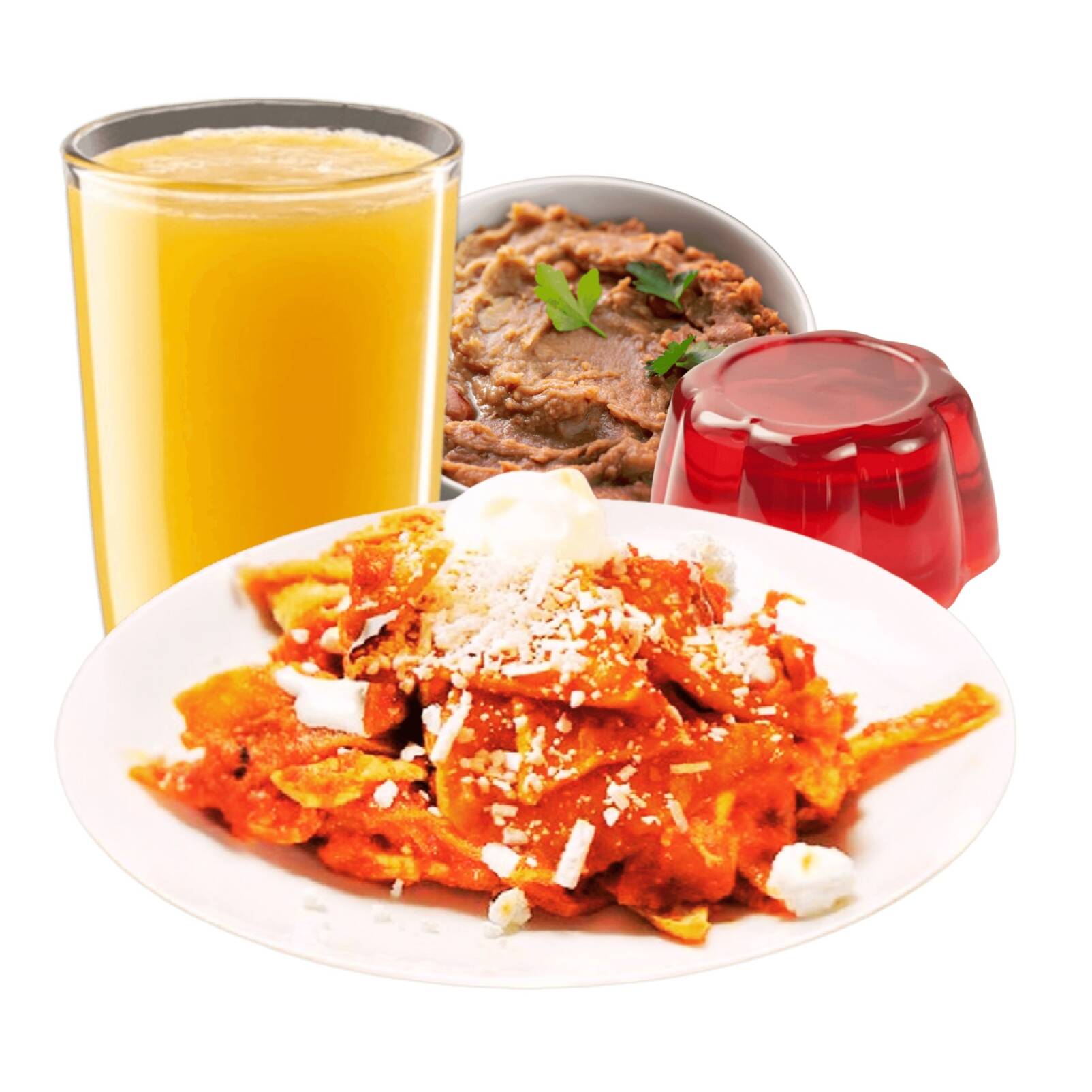 Chilaquiles Rojos con Pechuga de Pollo acompañados de Huevo Revuelto, Frijoles Fritos, Bolillo, Salsa de Tomate, Bebida y Postre a Elegir.