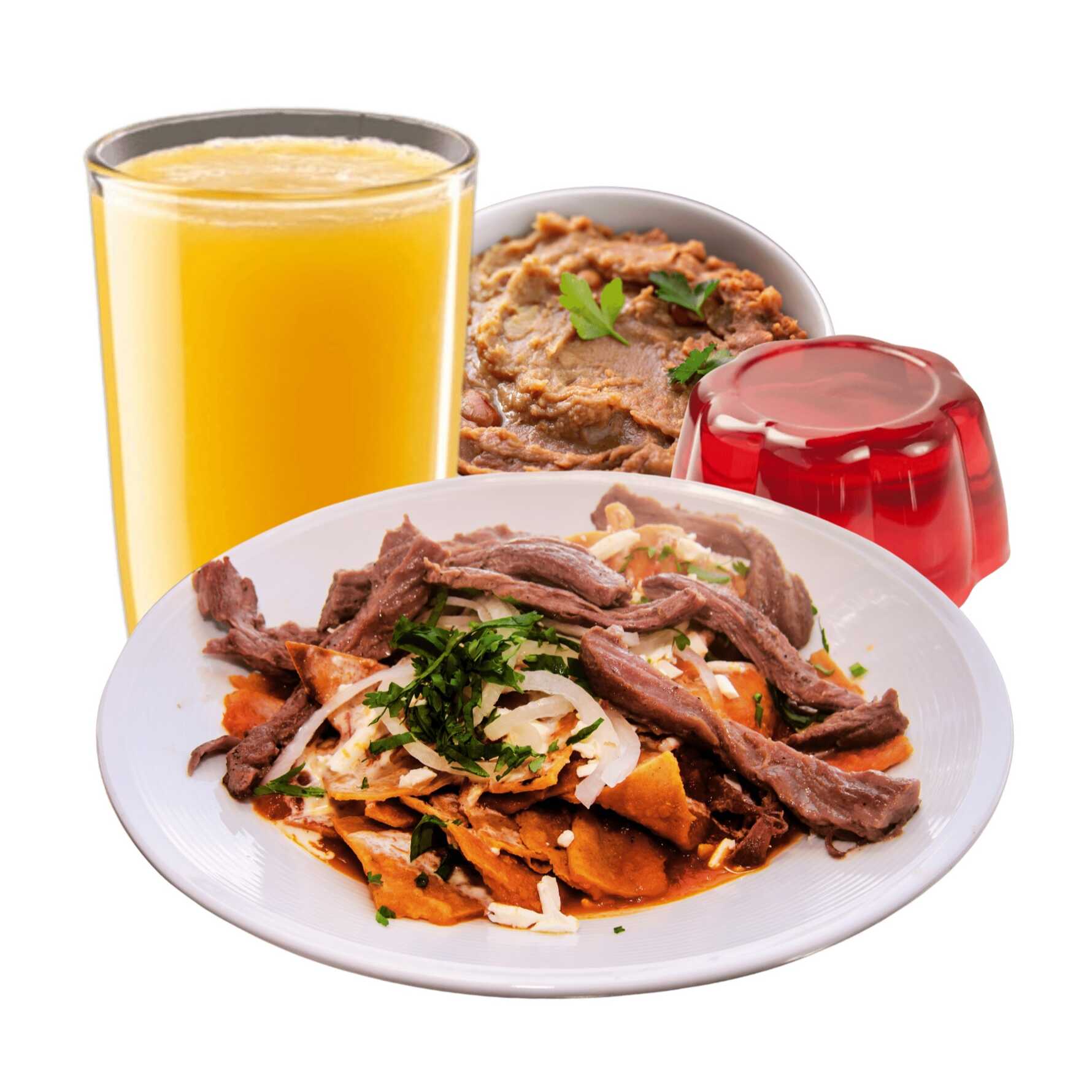 Chilaquiles Rojos con Arrachera acompañados de Huevo Revuelto, Frijoles Fritos, Bolillo, Salsa de Tomate, Postre y Bebida a Elegir.