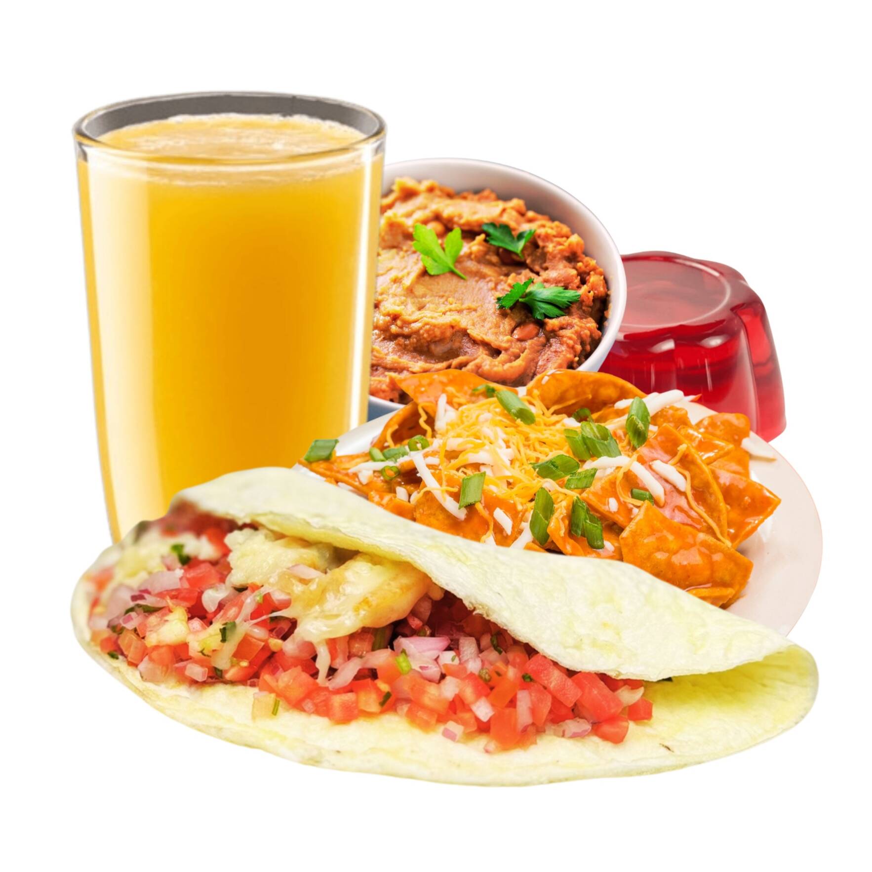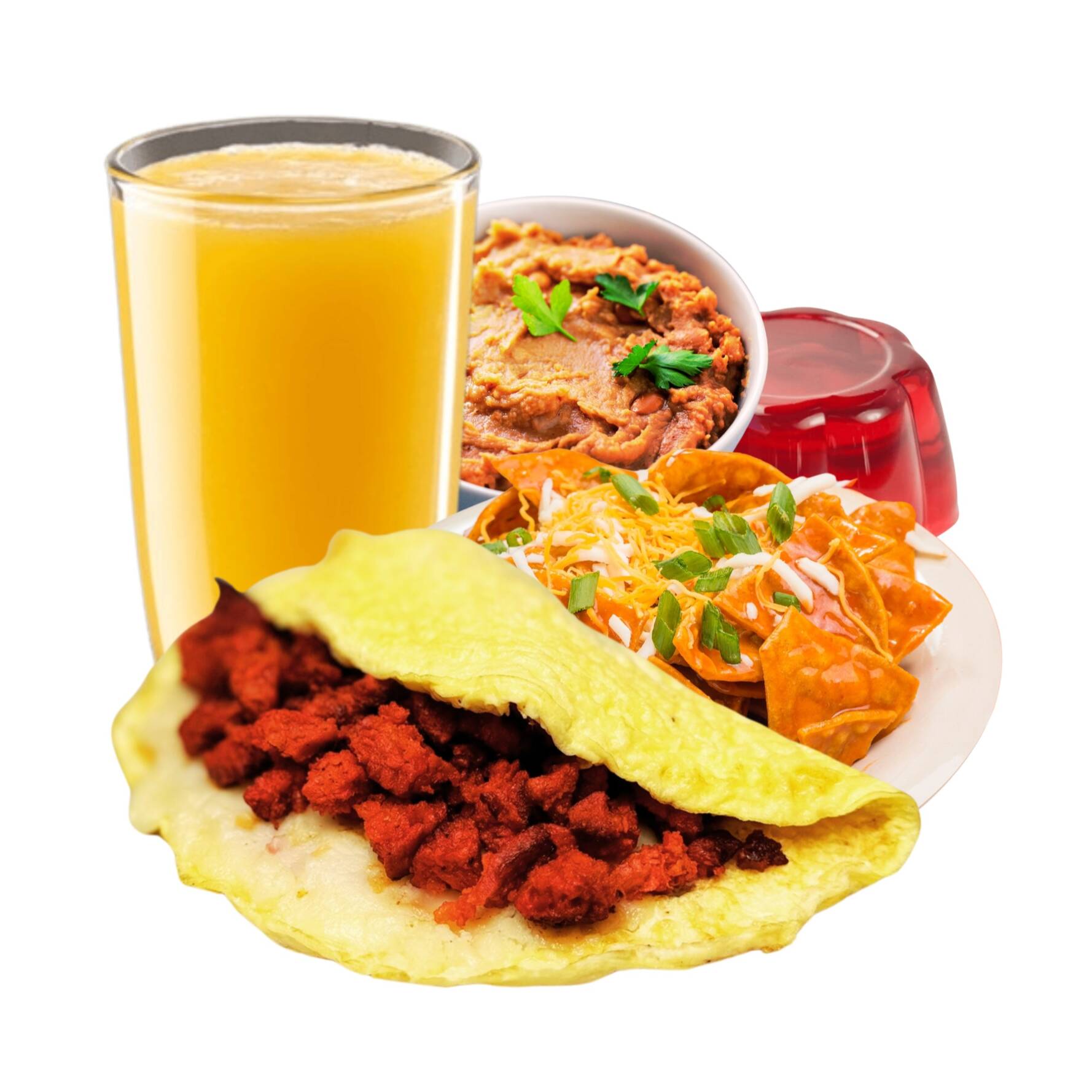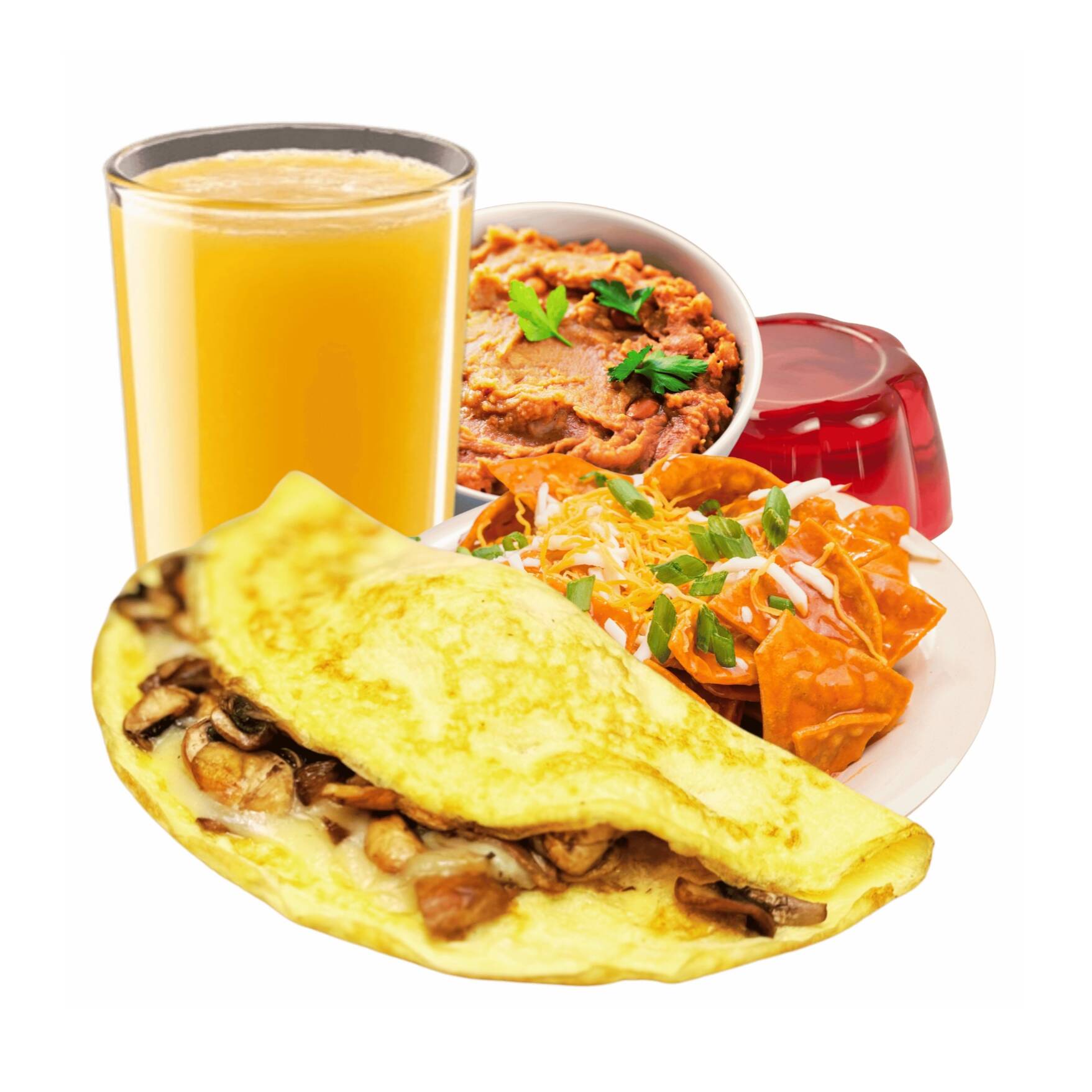 Tortilla de Claras de Huevo con Jitomate, Cebolla, Cilantro y Queso Manchego con Chilaquiles Rojos, Frijoles Fritos acompañado de Postre y Bebida a Elegir.