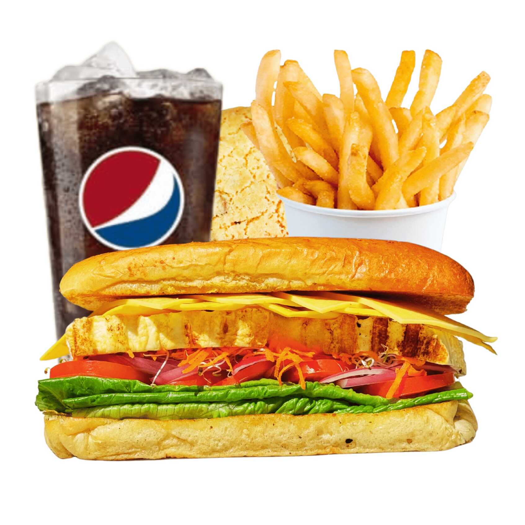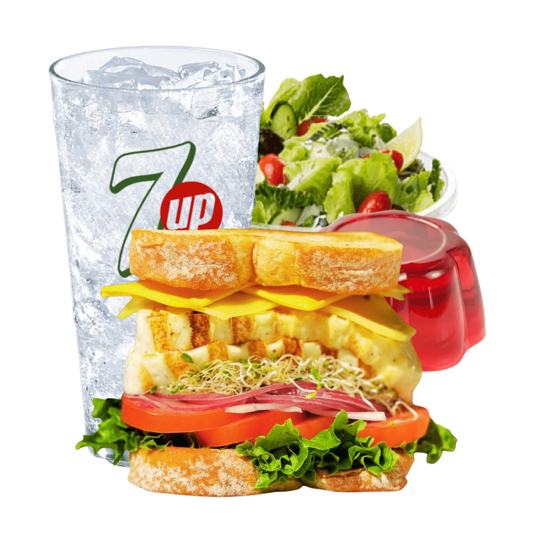 Sandwich de Pan Artesanal con Panela Asada, Queso Manchego, Lechuga, Jitomate, Cebolla, Germinado de Alfalfa, acompañado de Papas a la Francesa, Catsup, Jalapeños, Postre y Bebida a Elegir.
