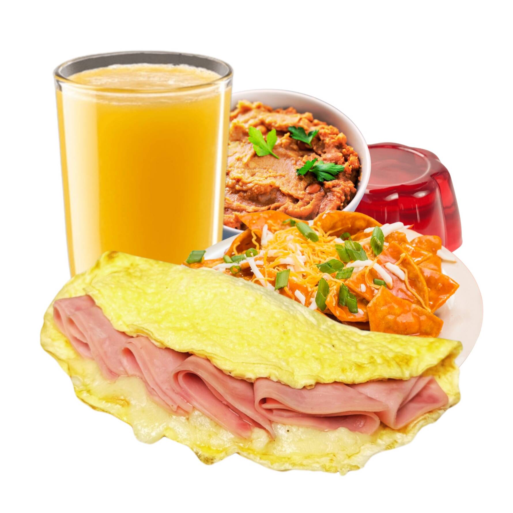 Tortilla de Huevo con Jamón y Queso Manchego acompañada de Chilaquiles Rojos y Frijoles Fritos con Bebida y Postre a Elegir.