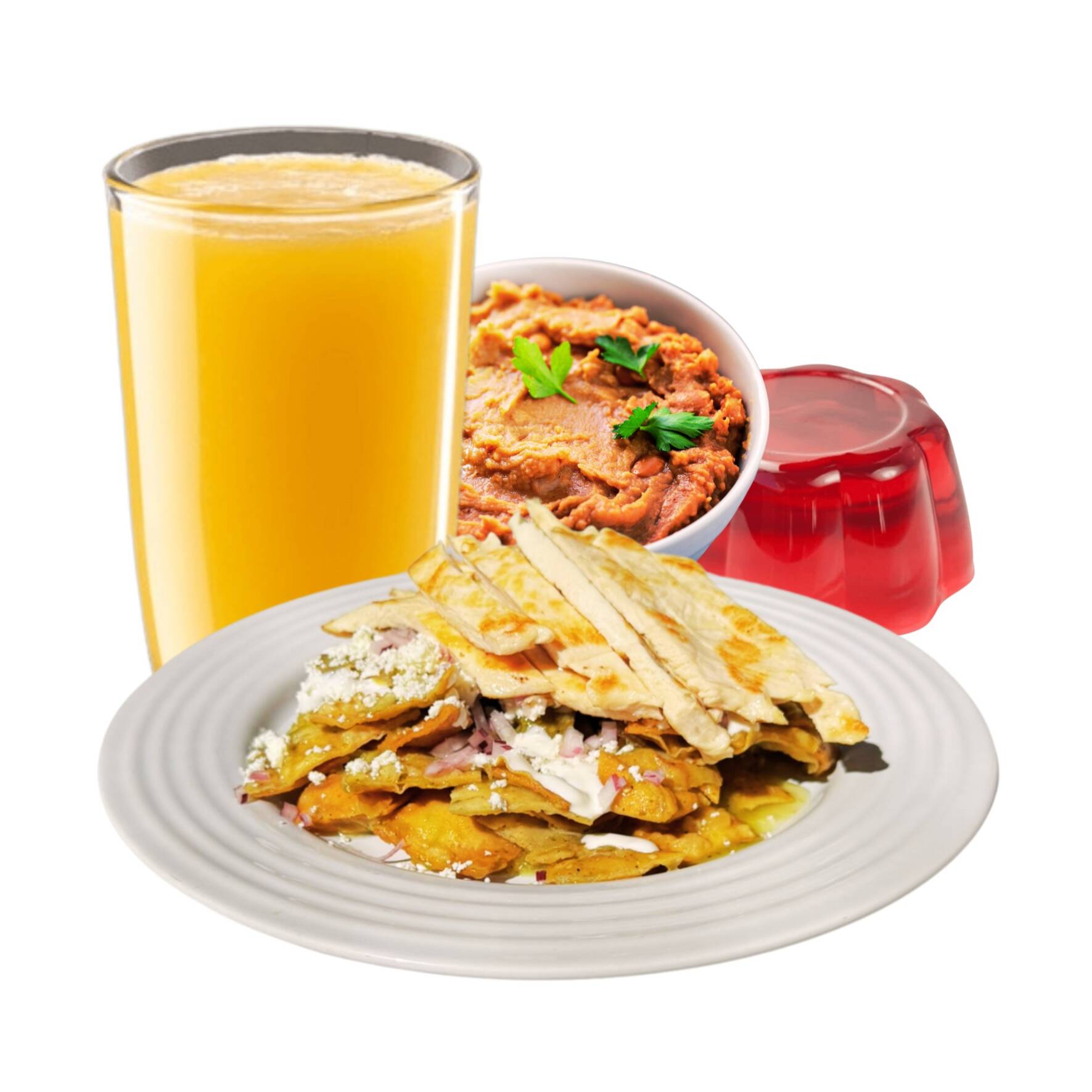 Orden de chilaquiles al gusto con crema, queso, cebolla, salsa de tomate, bolillo, 2 guarniciones, postre y bebida a elegir.