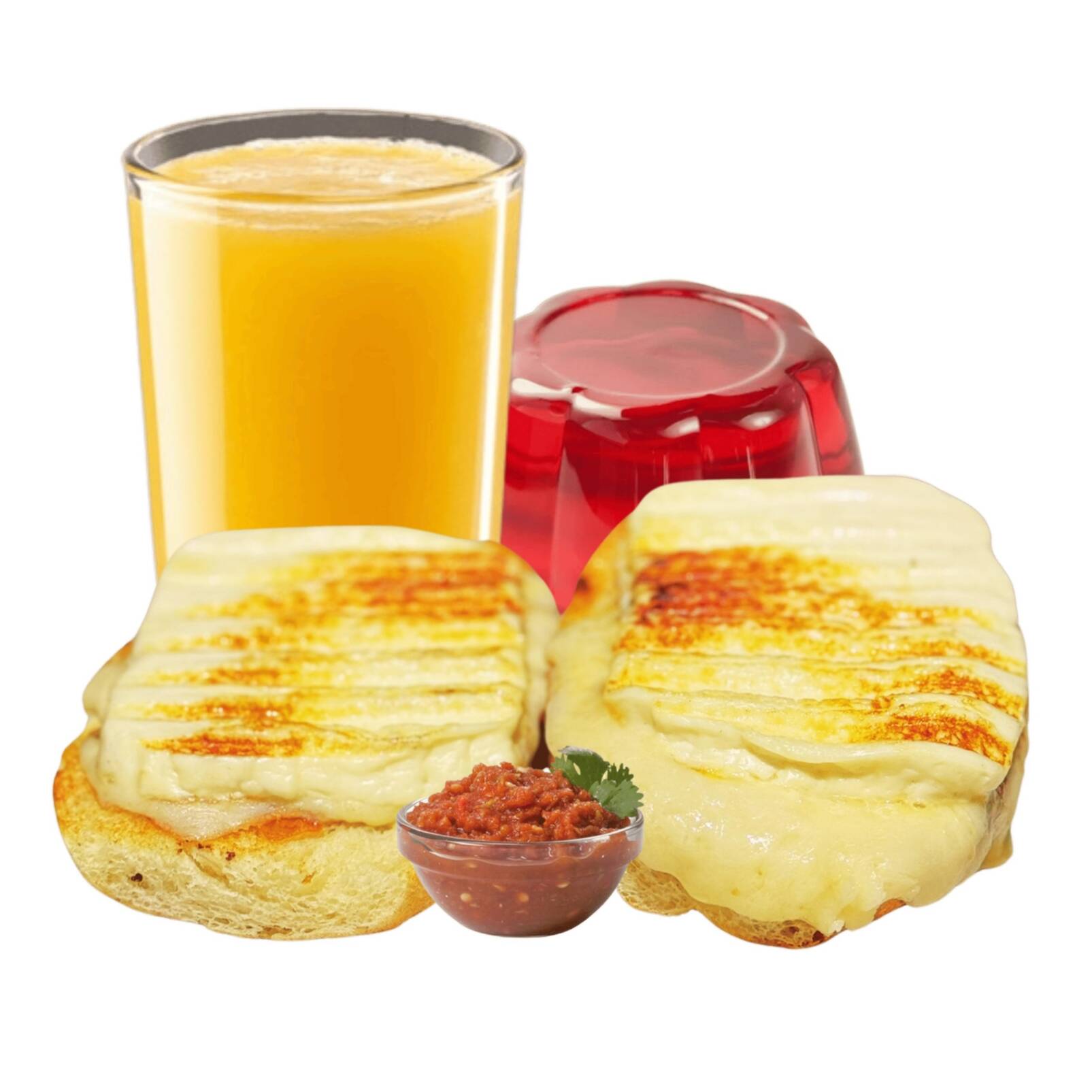 2 Mitades de Bolillo con Panela Asada y Queso Manchego acompañados de Salsa Mexicana, Salsa de Tomate, Postre y Bebida a Elegir.