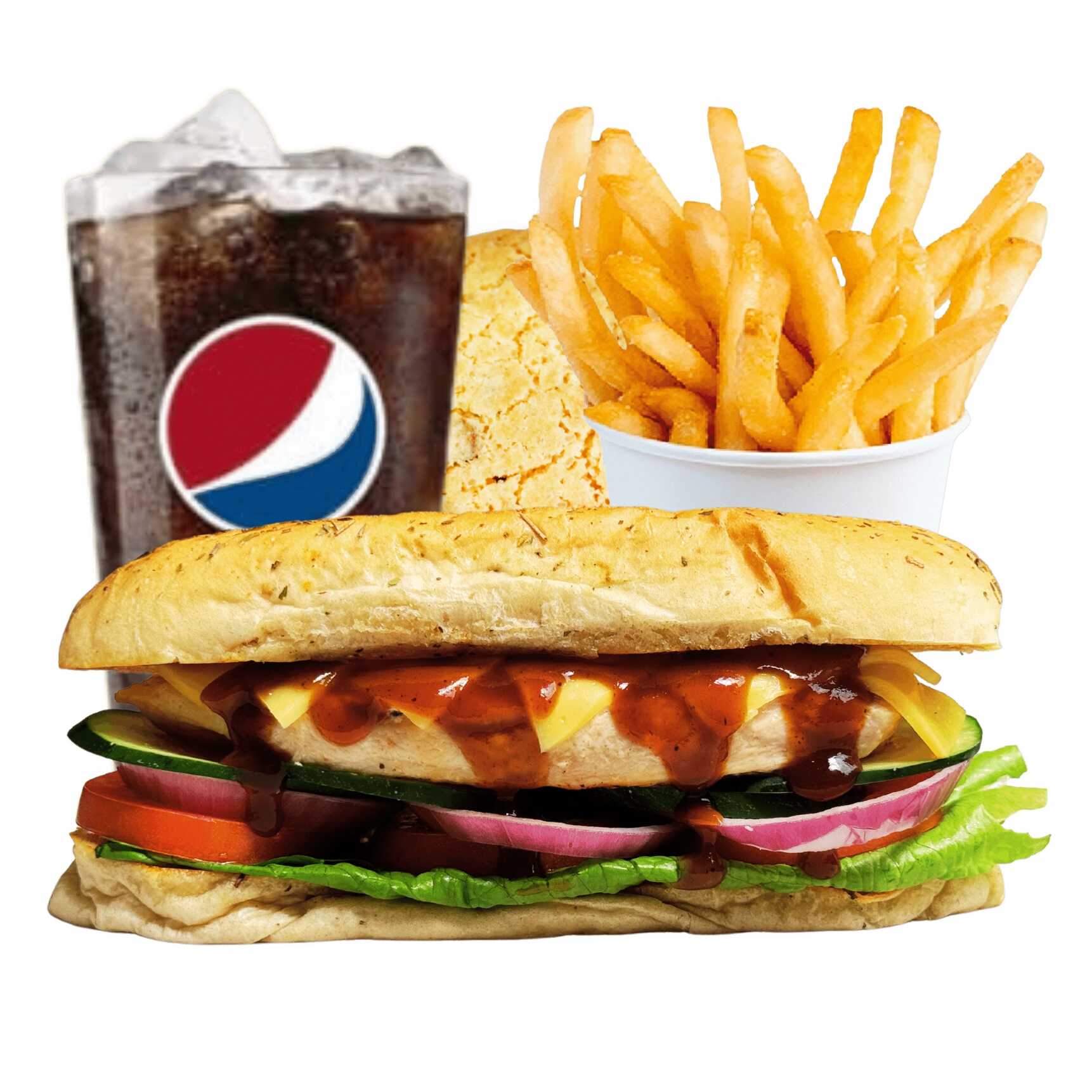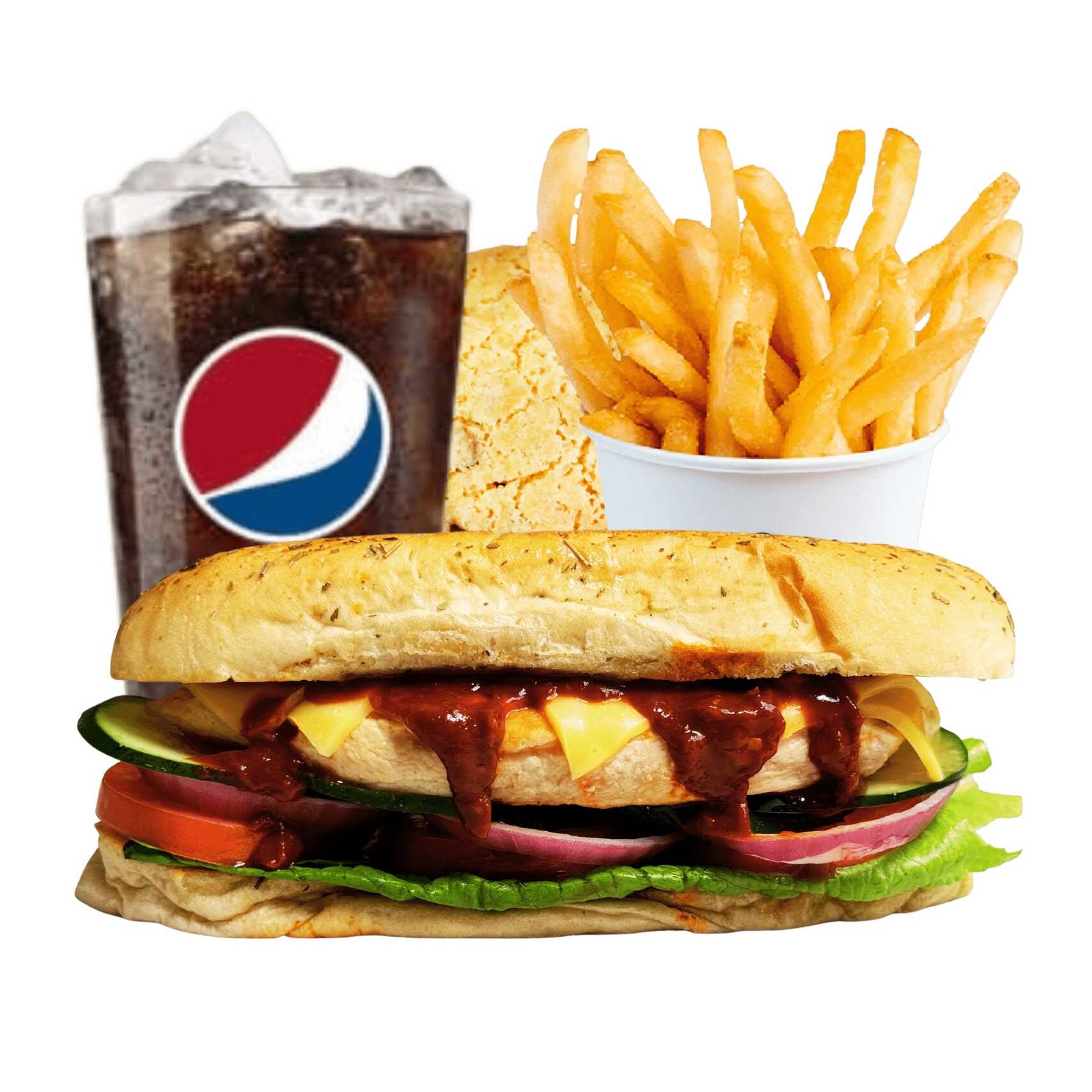 Panini de Pan Artesanal con Pechuga de Pollo al BBQ, Queso Manchego, Lechuga, Jitomate, Cebolla, Pepino acompañado de Papas a la Francesa, Catsup, Jalapeños, Bebida y Postre a Elegir.