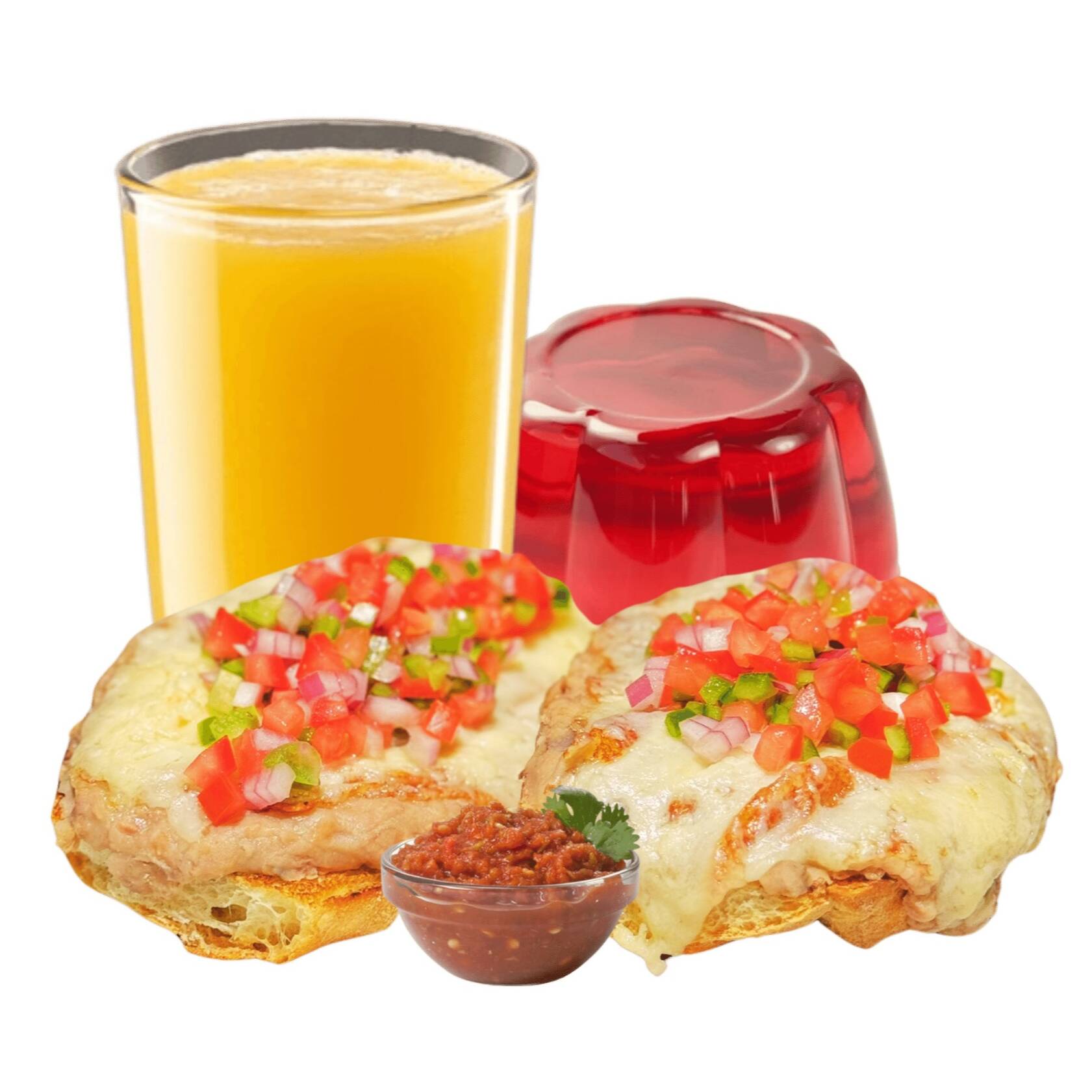 2 Mitades de Bolillo con Frijoles Fritos Recién Hechos con Queso acompañados de Salsa Mexicana, Salsa de Tomate, Postre y Bebida a Elegir.