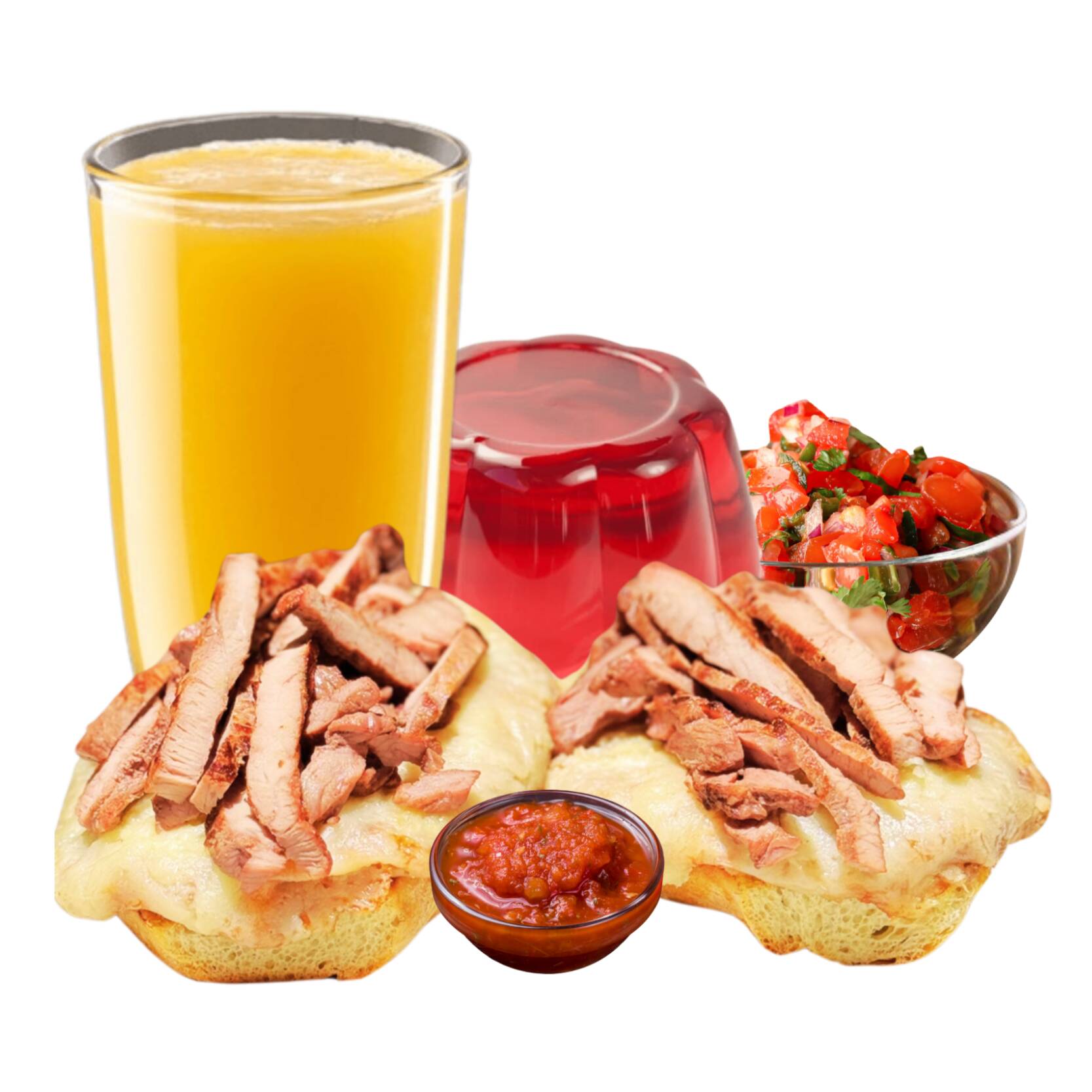 2 Mitades de Bolillo con Frijoles Fritos Recién Hechos con Queso con Arrachera acompañados de Salsa Mexicana, Salsa de Tomate, Postre y Bebida a Elegir.