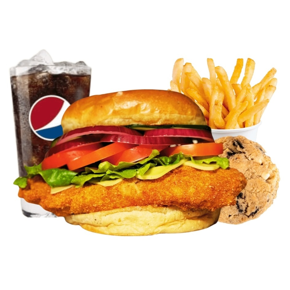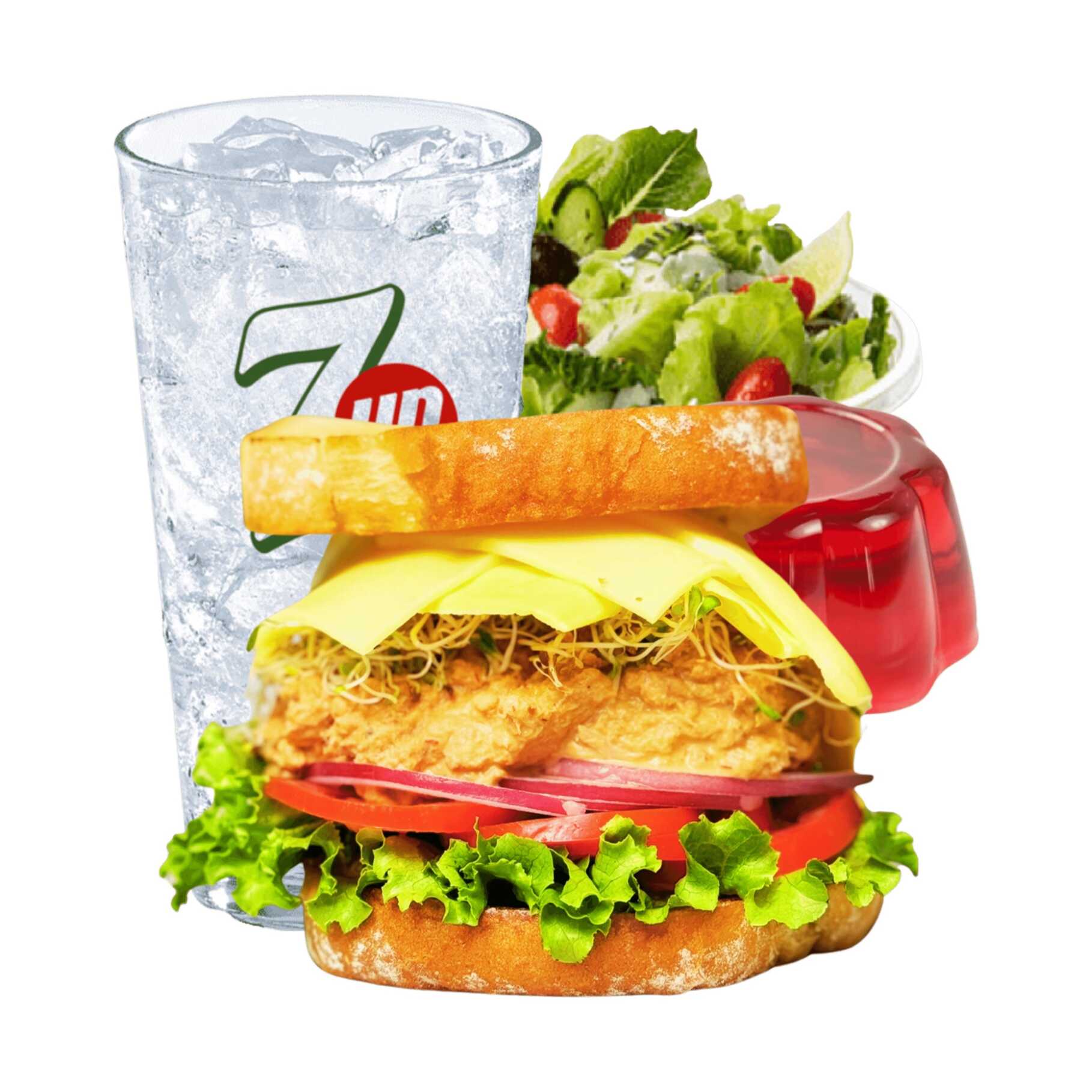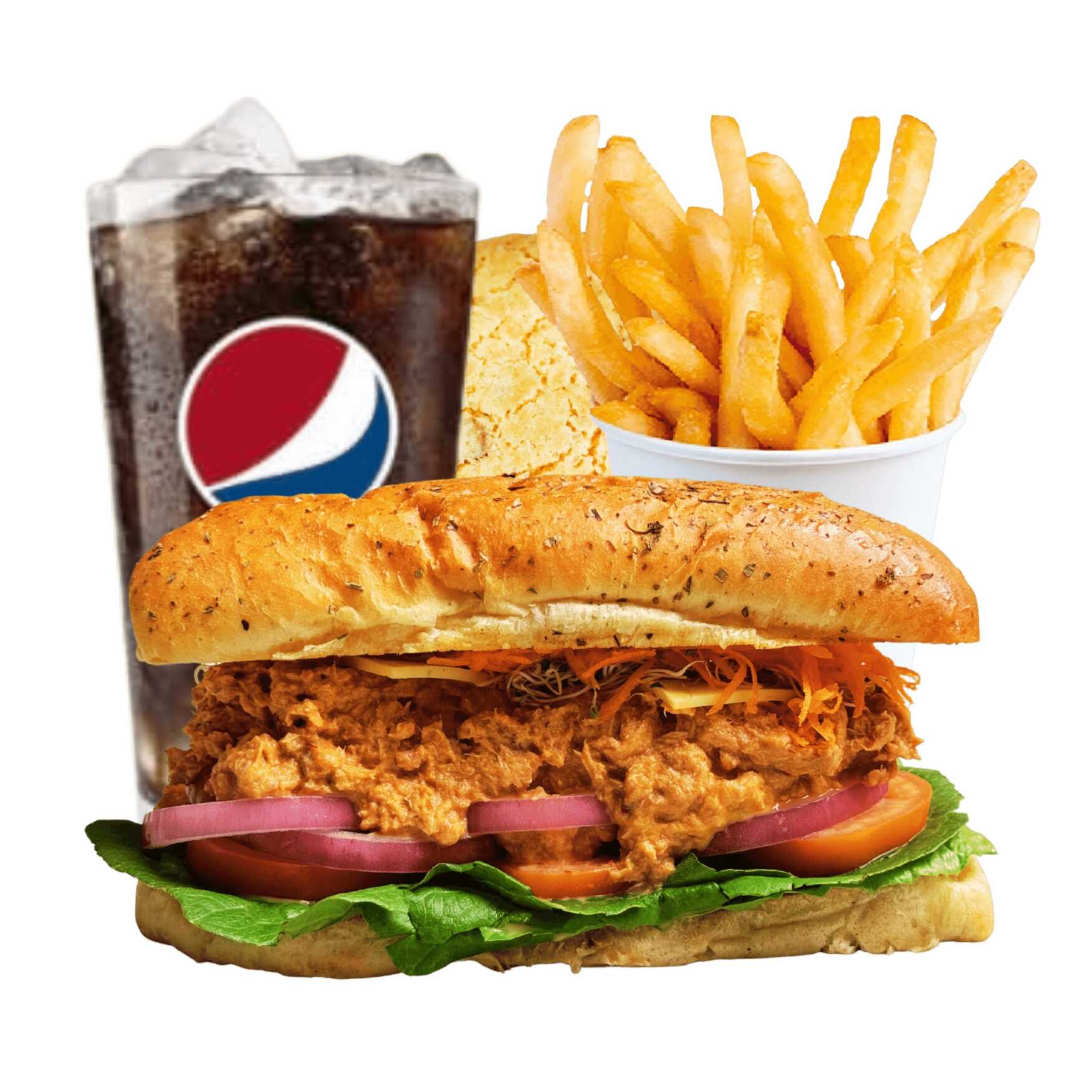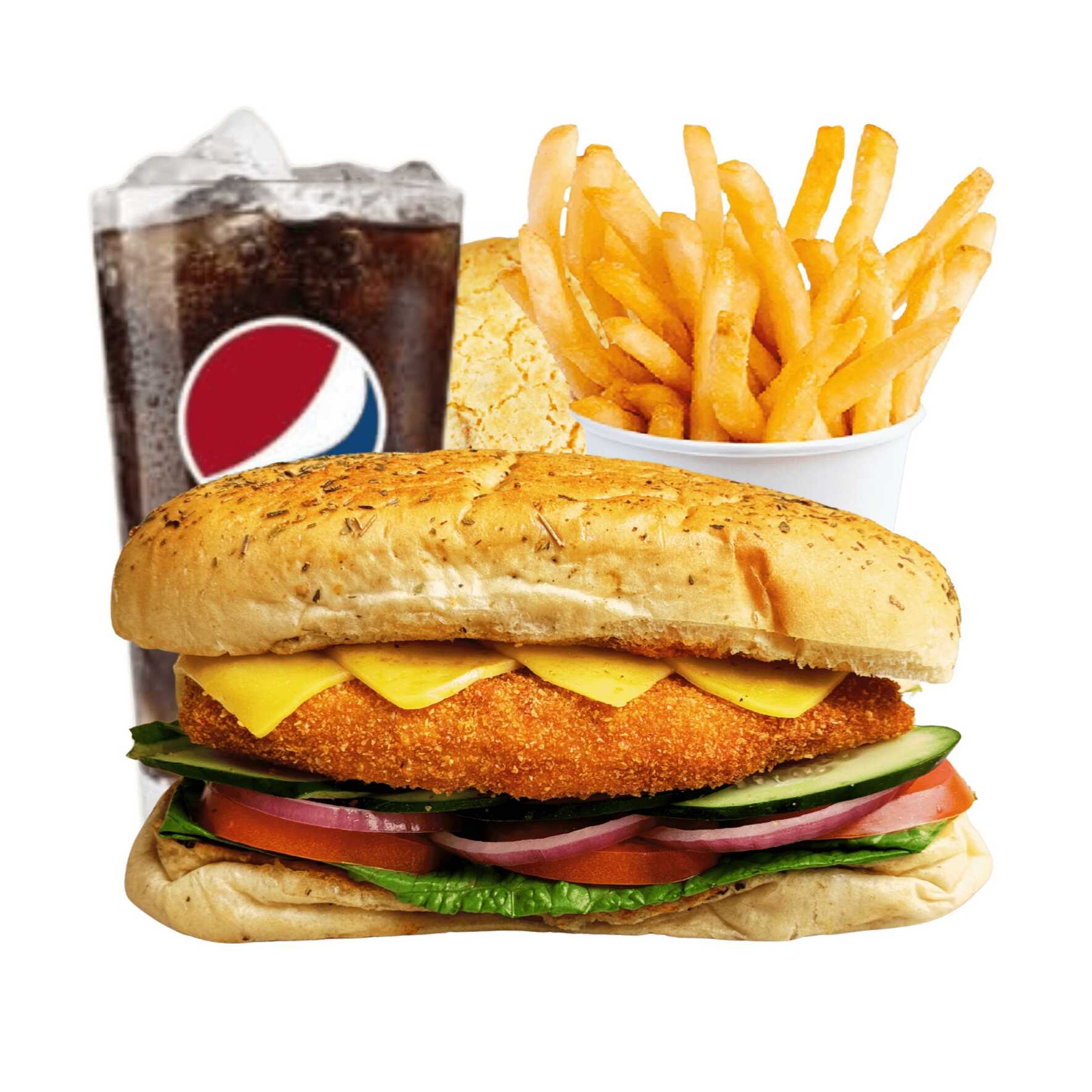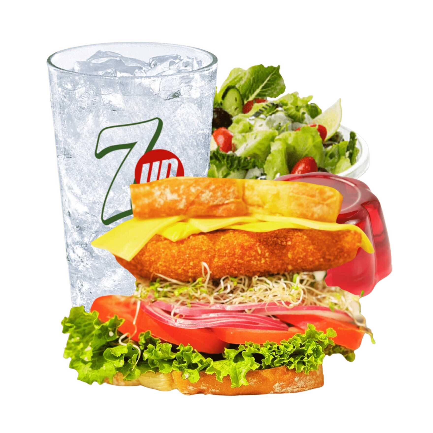 Sandwich de Pan Artesanal con Pechuga de Pollo Empanizado, Queso Manchego, Lechuga, Jitomate, Cebolla y Germinado de Alfalfa acompañado Papas a la Francesa sazonadas, Catsup, Jalapeños, Postre y Bebida a Elegir.