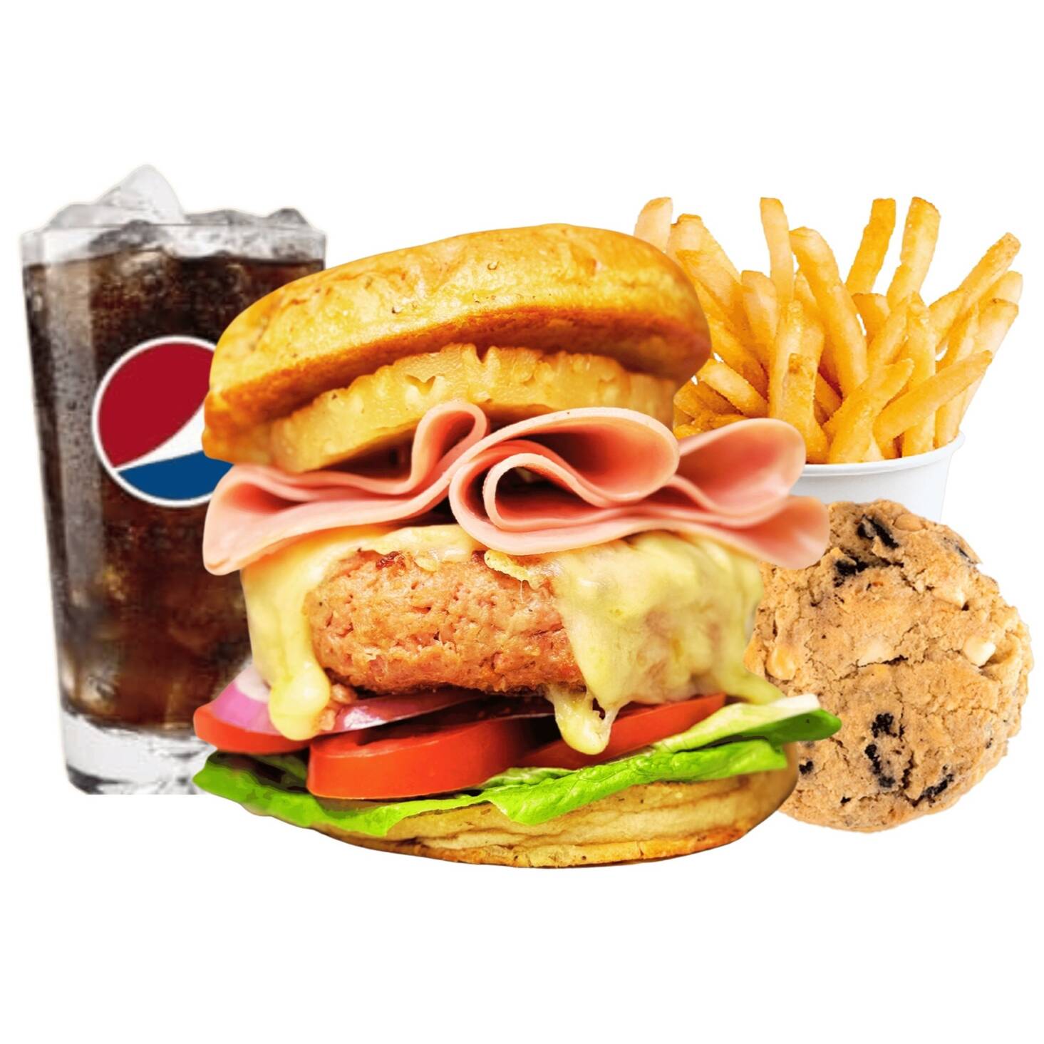 Hamburguesa de Pan Artesanal con Huevo Revuelto, Jamón de Pavo, Queso Manchego acompañado de Papas a la Francesa, Catsup, Jalapeños, Postre y Bebida a Elegir.