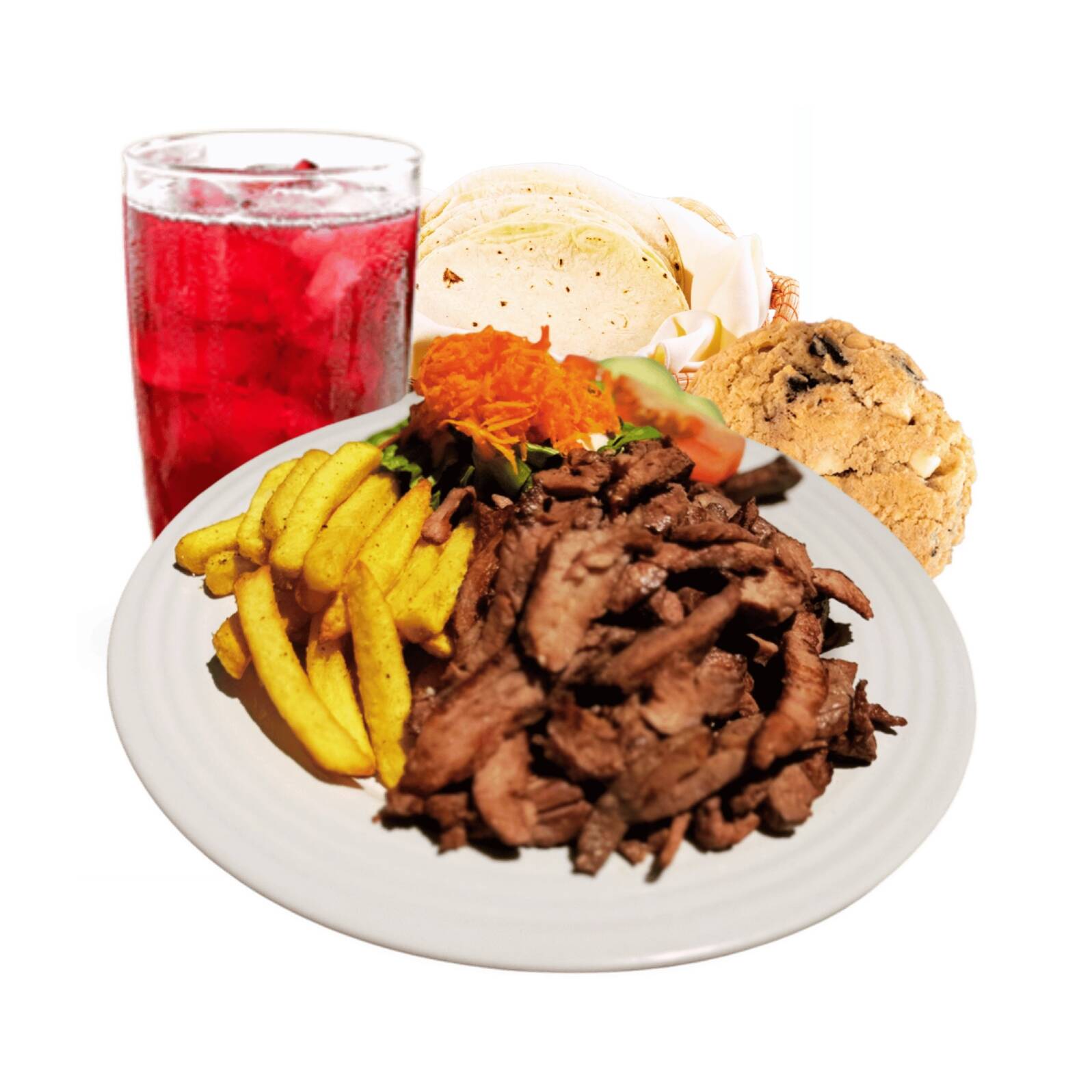 Orden de Arrachera Marinada Picada con Papas a la Francesa, Ensalada César, Tortillas y Salsa de Tomate, con postre y bebida a elegir.