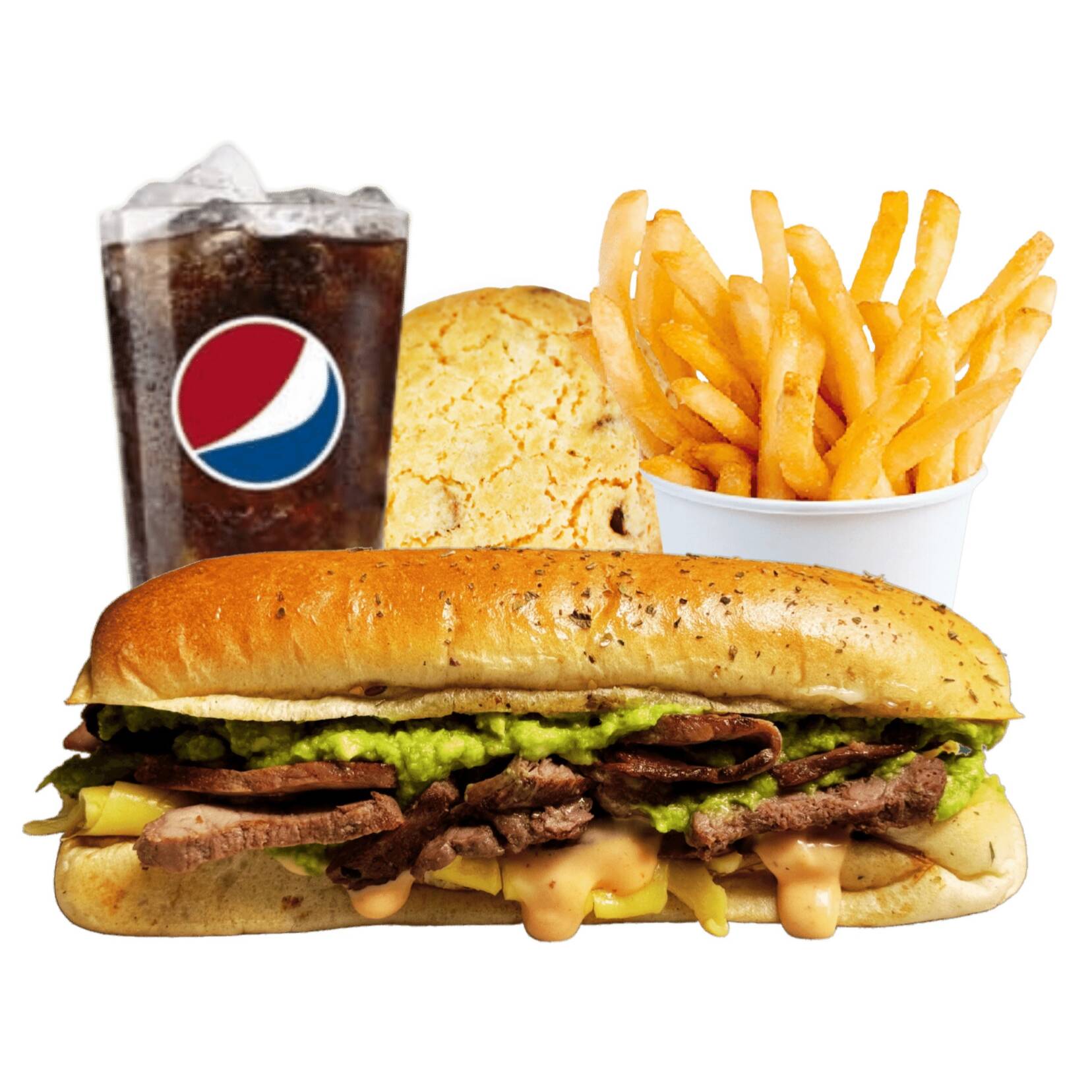 Panini de Pan Artesanal con Arrachera Marinada Picada con Guacamole, Queso Manchego, Aderezo Chipotle, acompañado de Guarnición, Postre y Bebida a Elegir.