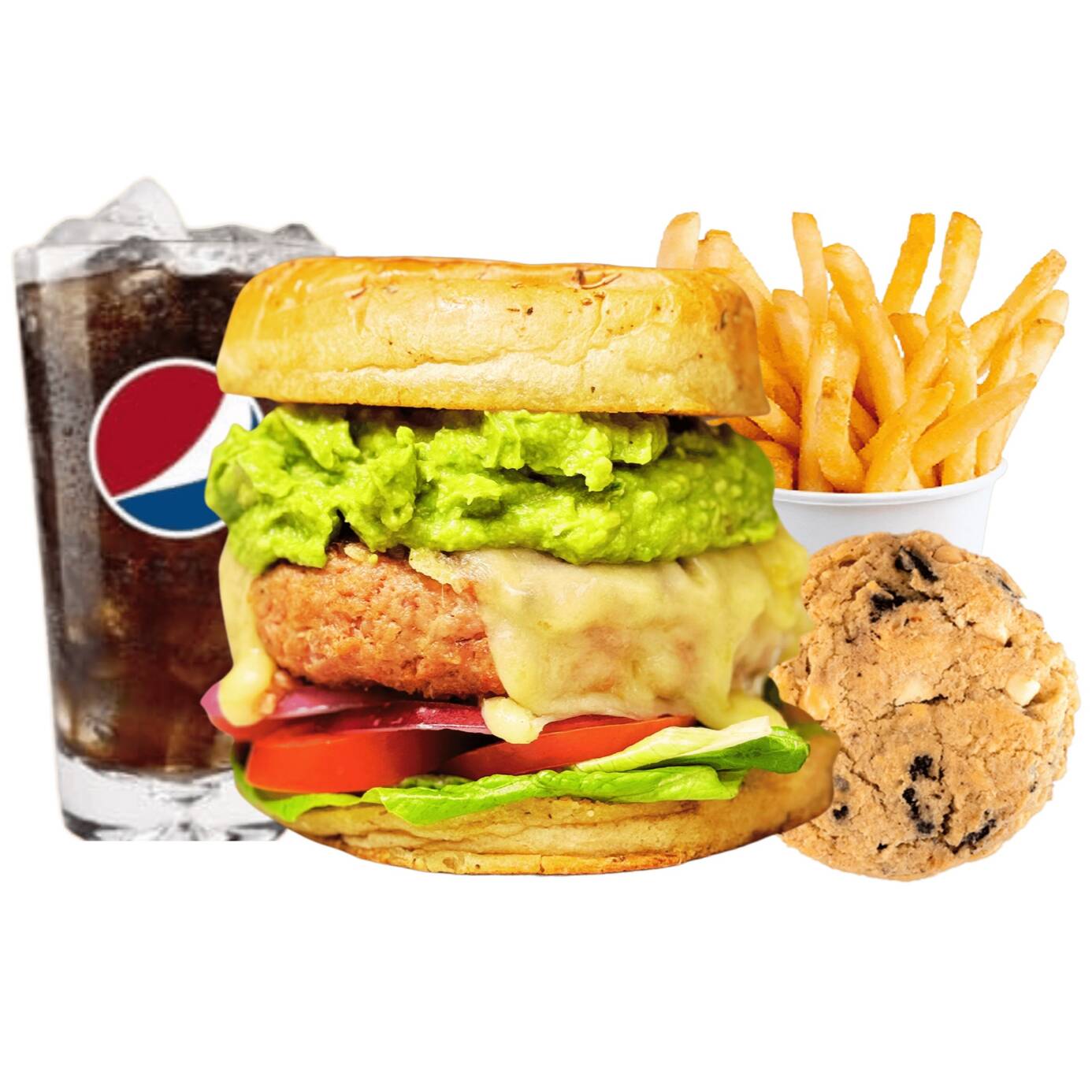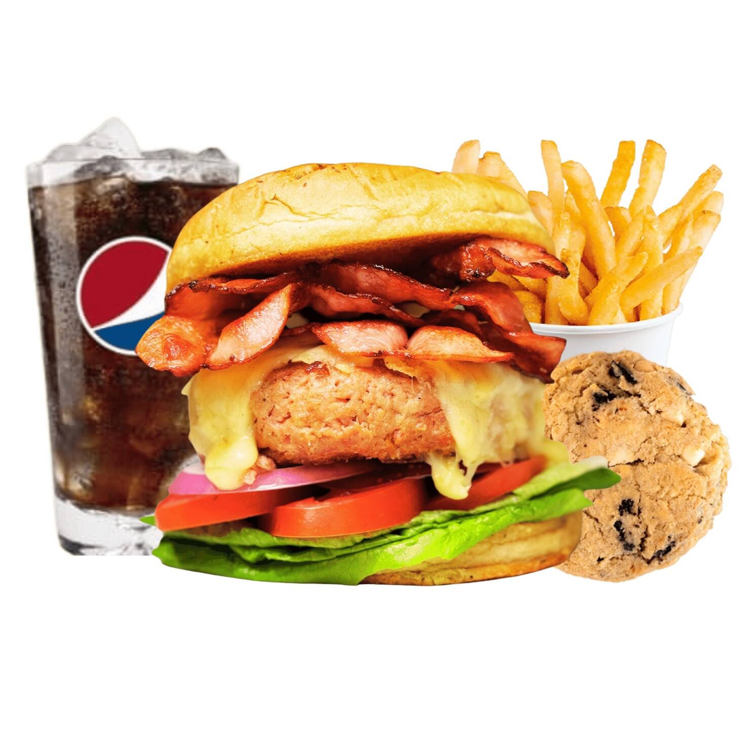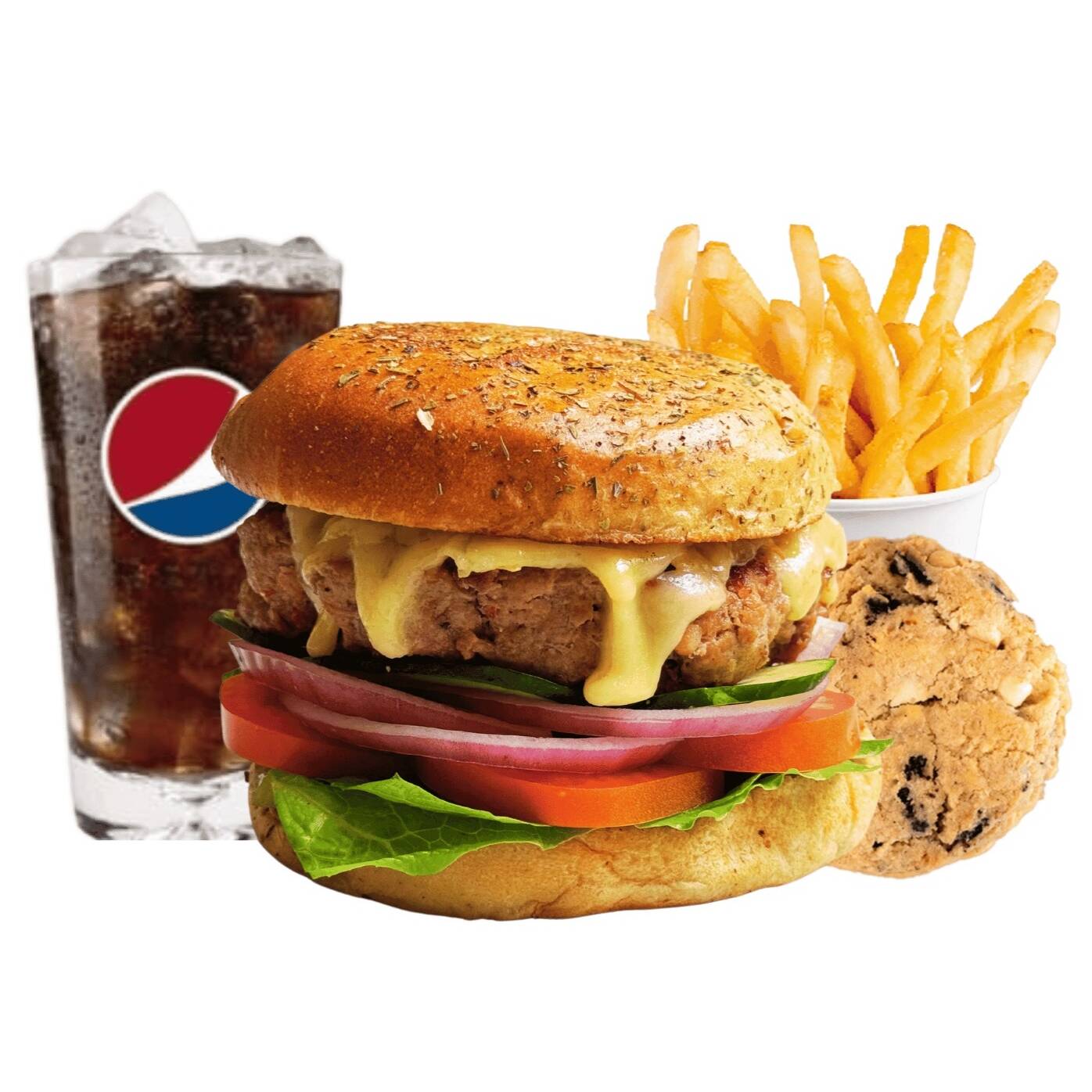 Hamburguesa de Pan Artesanal con Pechuga de Pollo a la Plancha, Queso Manchego, Lechuga, Jitomate, Cebolla, Pepino acompañada de Papas a la Francesa, Catsup, Jalapeños, Bebida y Postre a Elegir.