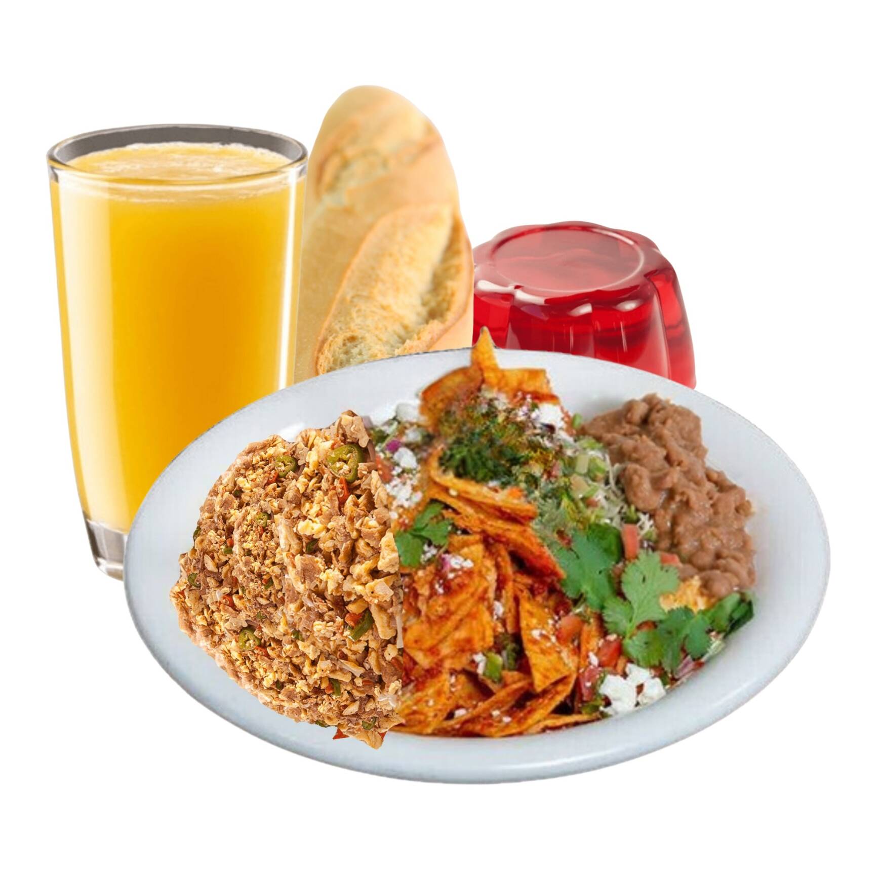 Machaca con Huevo Revuelto acompañada de Chilaquiles Rojos y Frijoles Fritos, Bolillo, Salsa de Tomate, Postre y Bebida a Elegir.