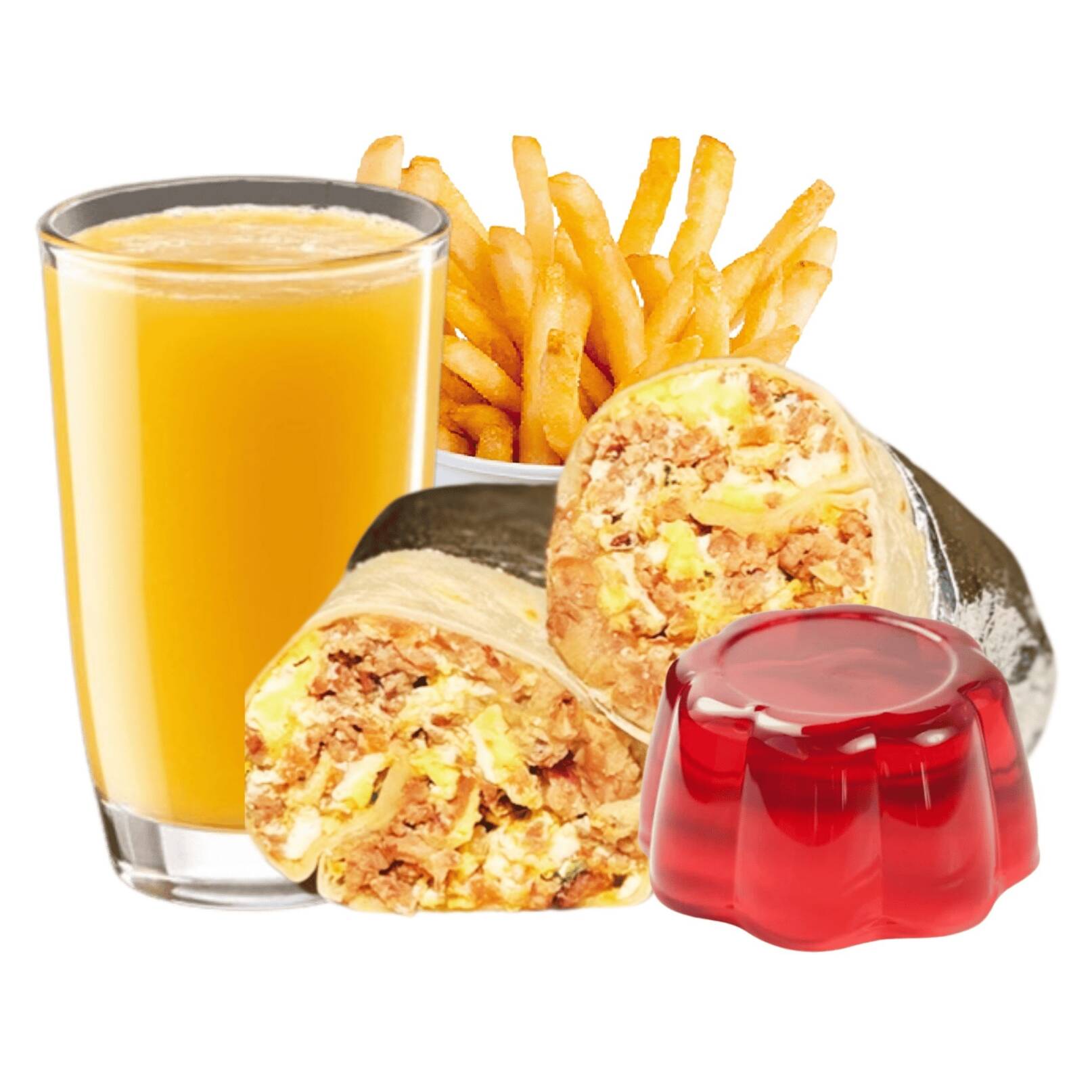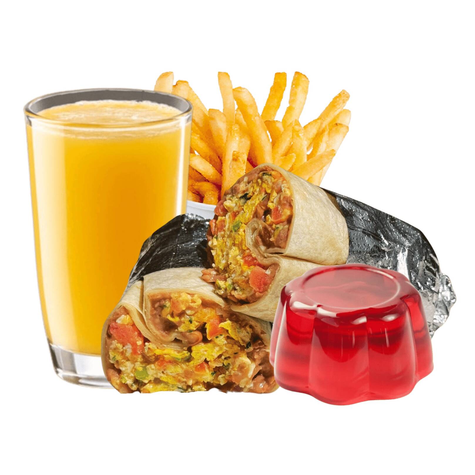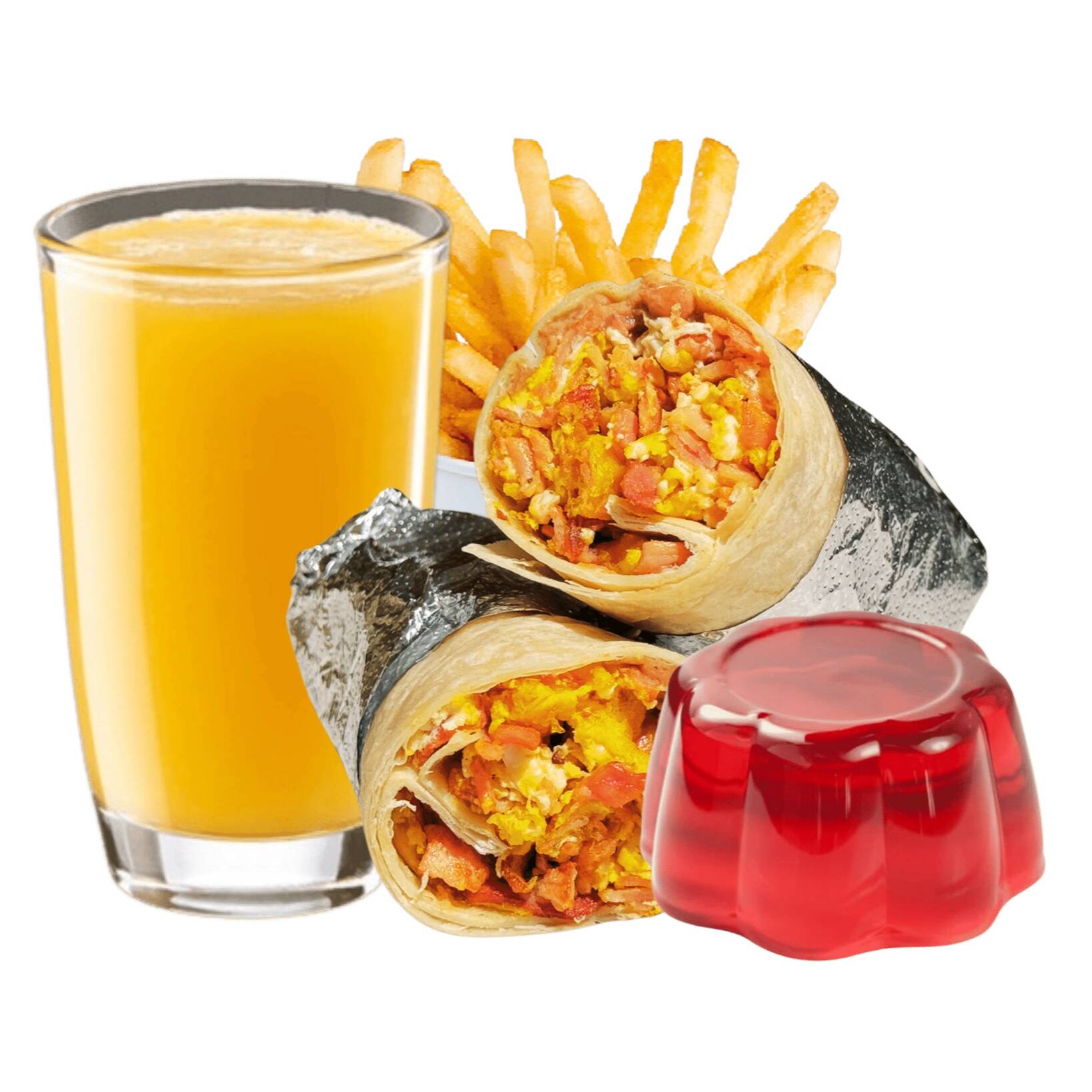 Burrito de tortilla de harina extra grande de 30 cm partido a la mitad con huevo revuelto con tocino, jitomate, cebolla, cilantro y frijoles fritos, salsa de tomate, postre y bebida a elegir.