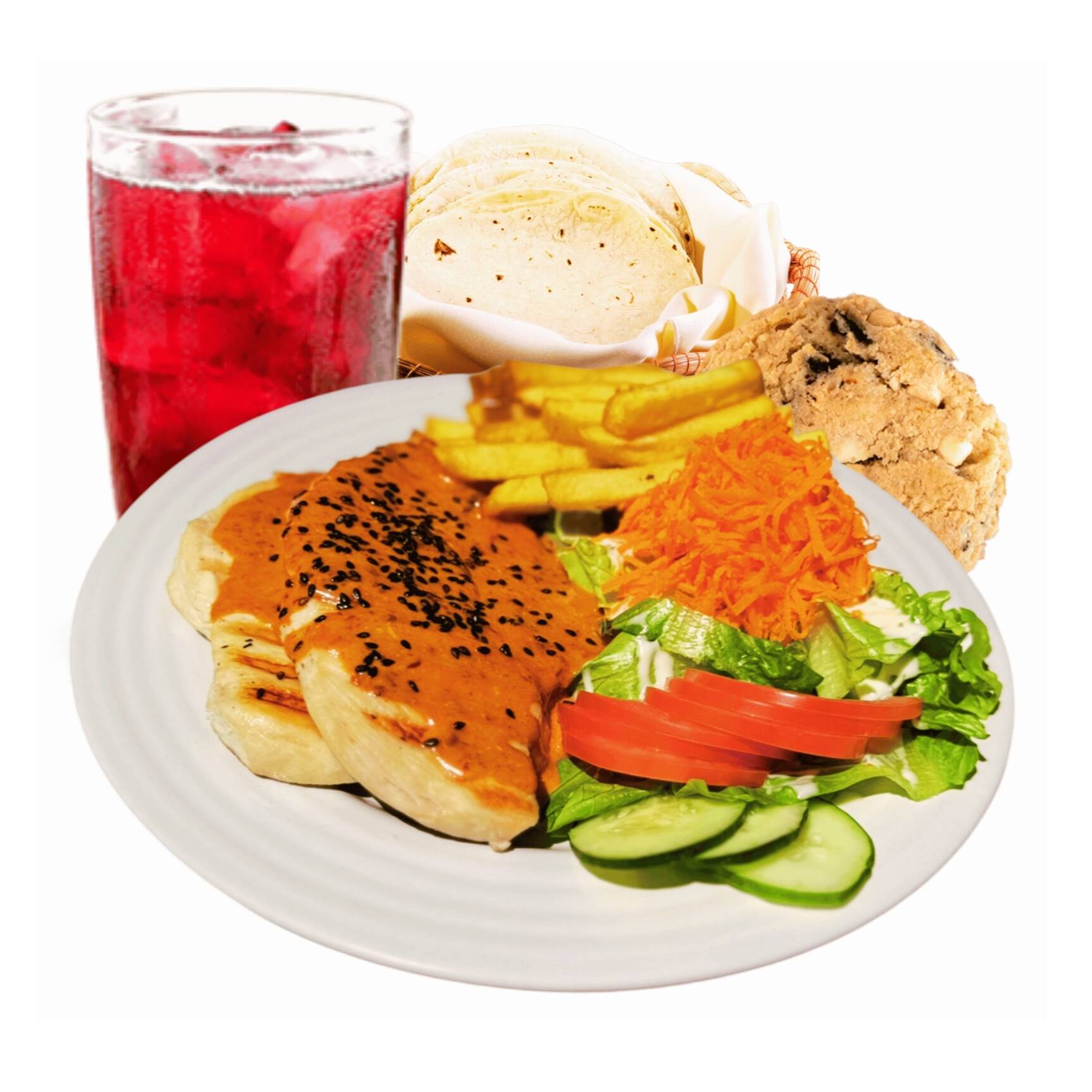 Pechuga de Pollo con Salsa Chipotle acompañado de Papas a la Francesa y Ensalada César, Postre y Bebida a Elegir.