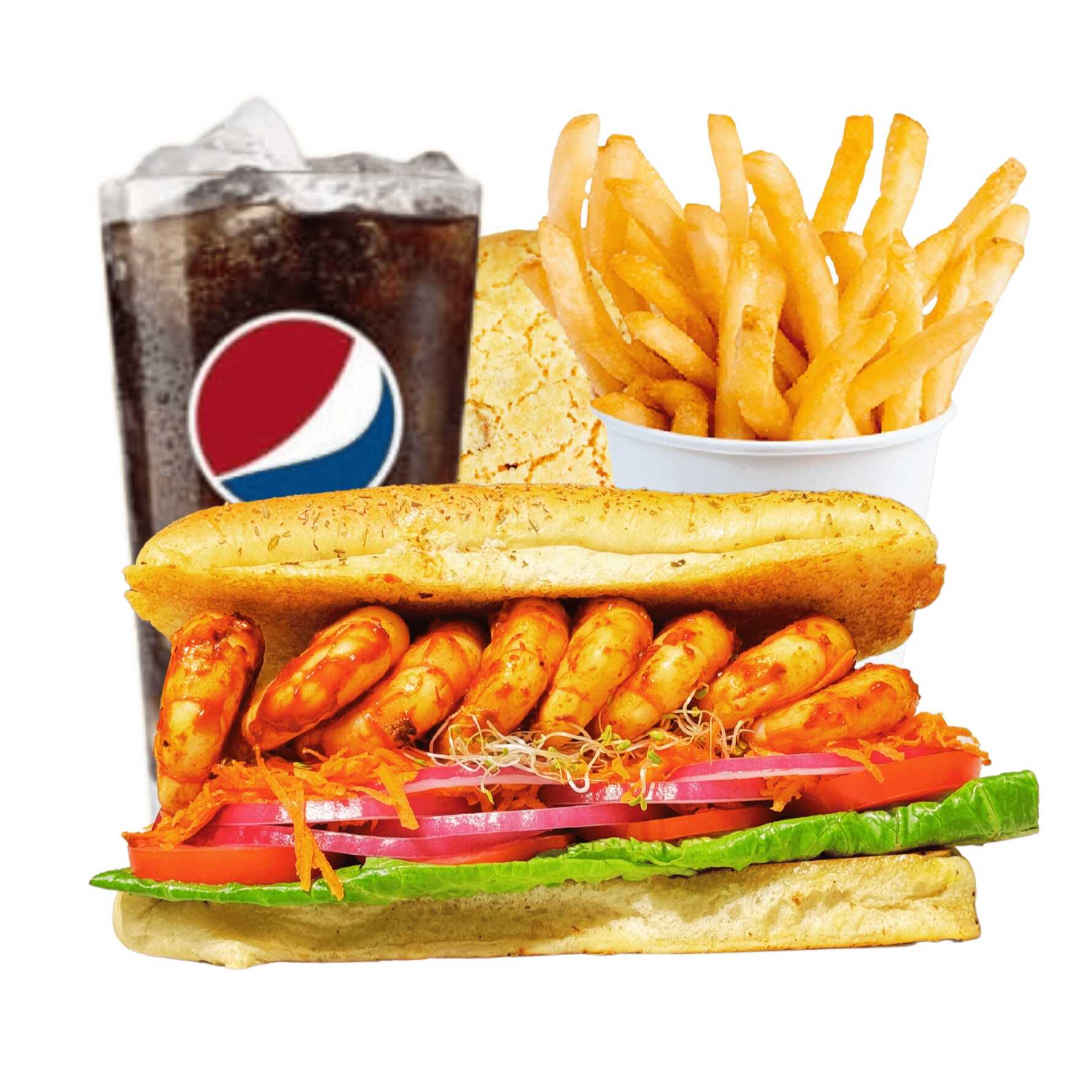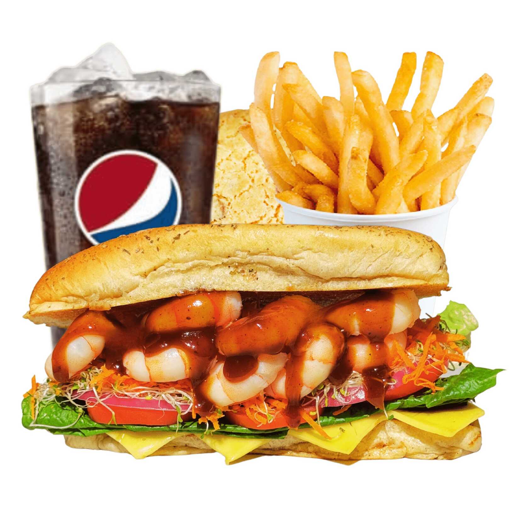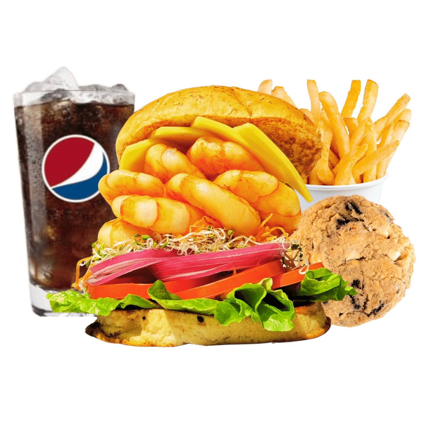 Panini de Pan Artesanal con Camarones al BBQ, Queso Manchego, Zanahoria, Germinado de Alfalfa, Lechuga, Jitomate, Cebolla. acompañado de Papas a la Francesa, Catsup, Jalapeños, Bebida y Postre a Elegir.