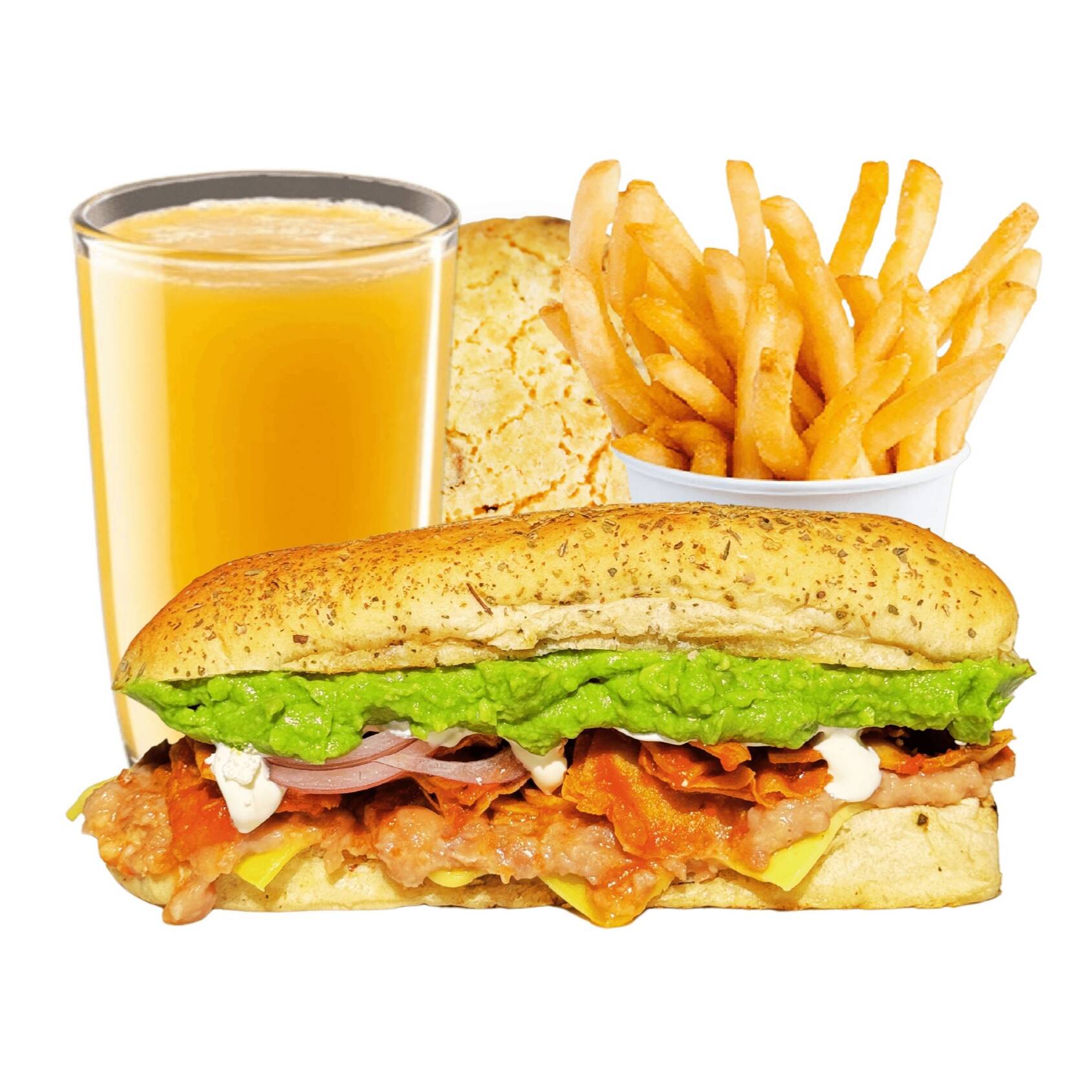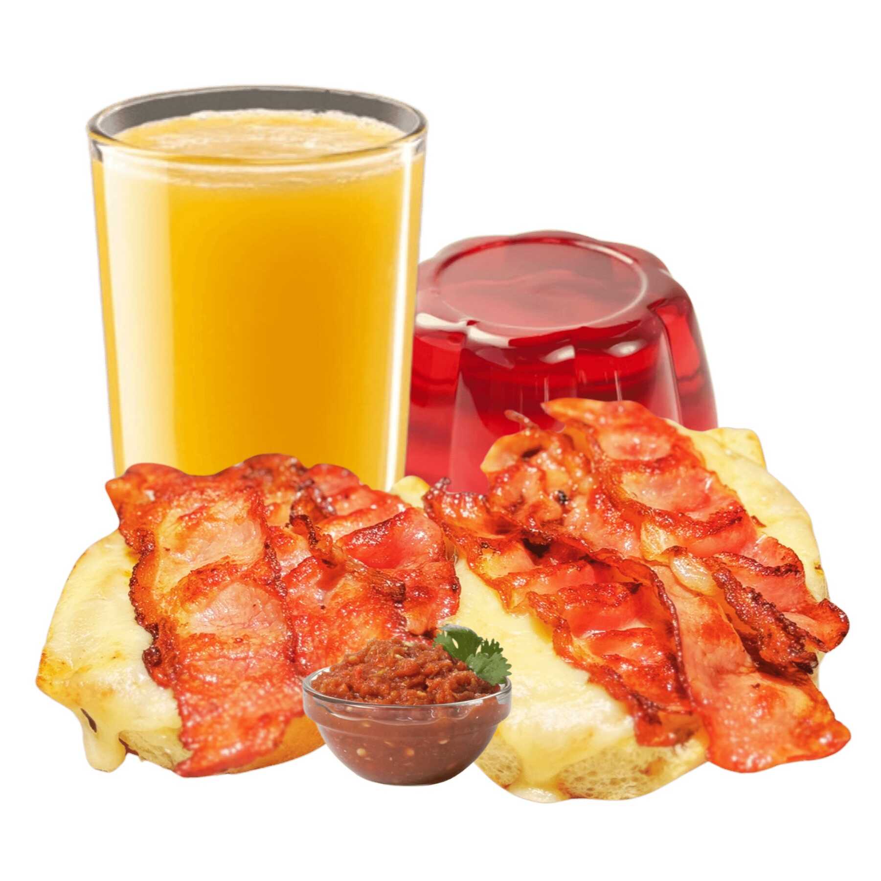 2 Mitades de Bolillo con Tocino Crujiente , Frijoles Fritos, Queso Gratinado acompañados de Salsa Mexicana, Salsa de Tomate, Postre y Bebida a Elegir.