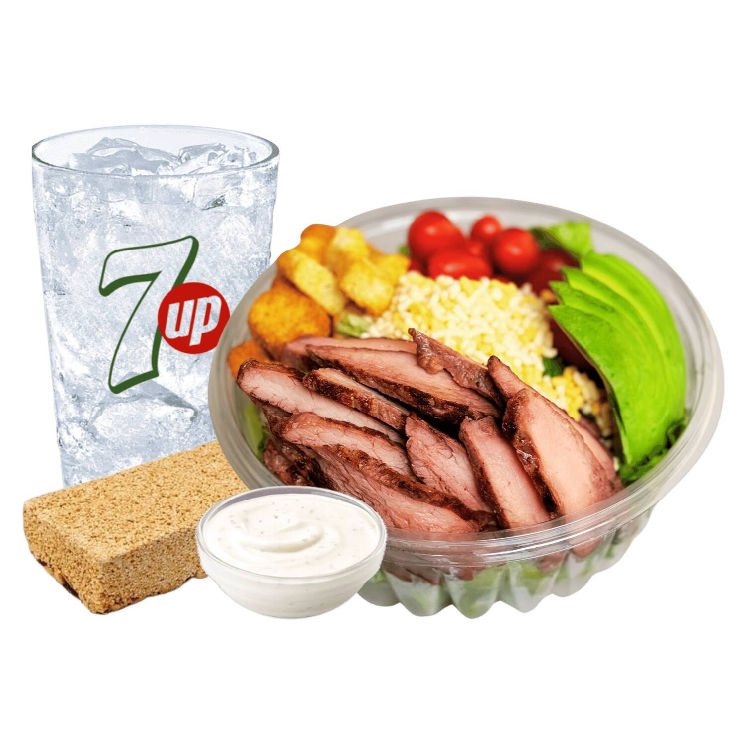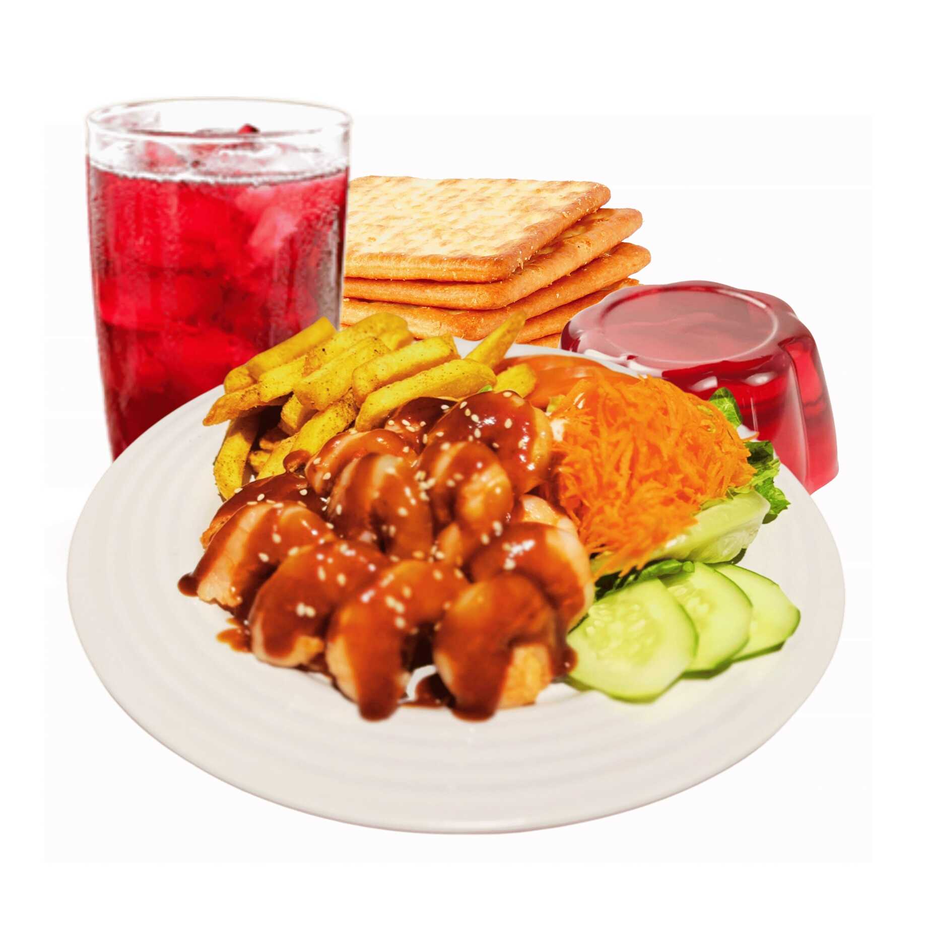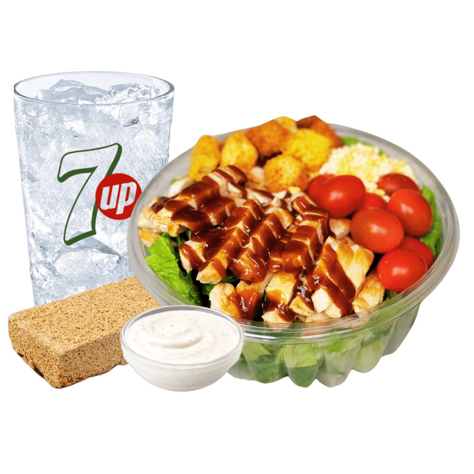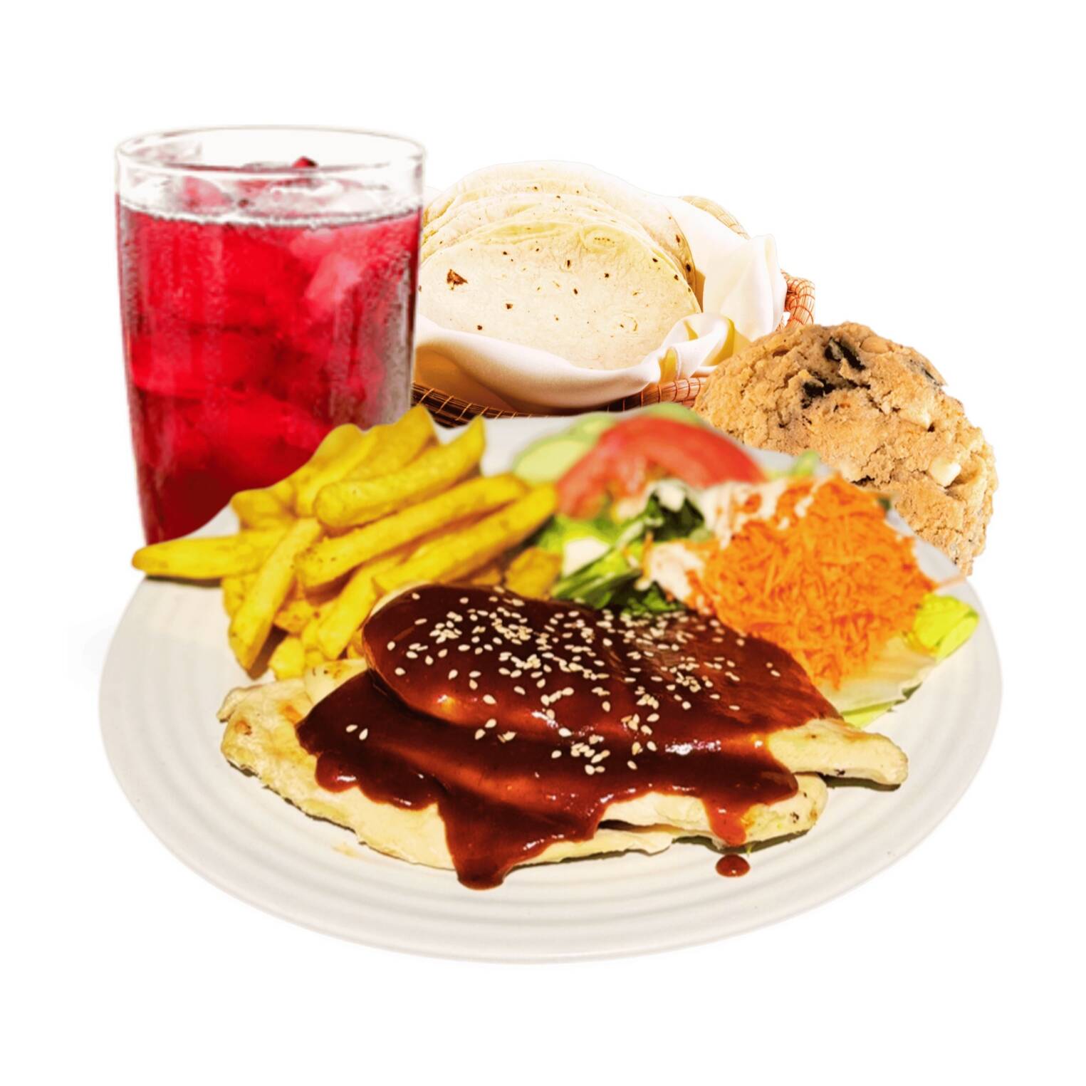 Pechuga de Pollo con Salsa BBQ acompañada de Papas a la Francesa y Ensalada César, Postre y Bebida a Elegir.