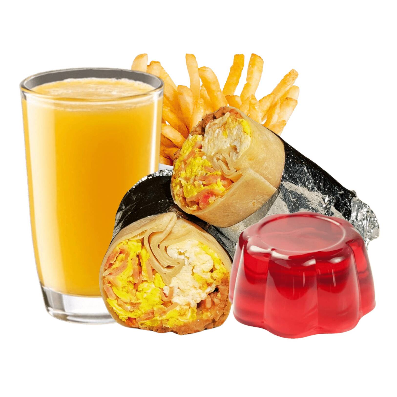 Burrito de tortilla de hariBurrito de tortilla de harina extra grande de 30 cm partido a la mitad con huevo revuelto con jamón y frijoles fritos, salsa de tomate, postre y bebida a elegir.