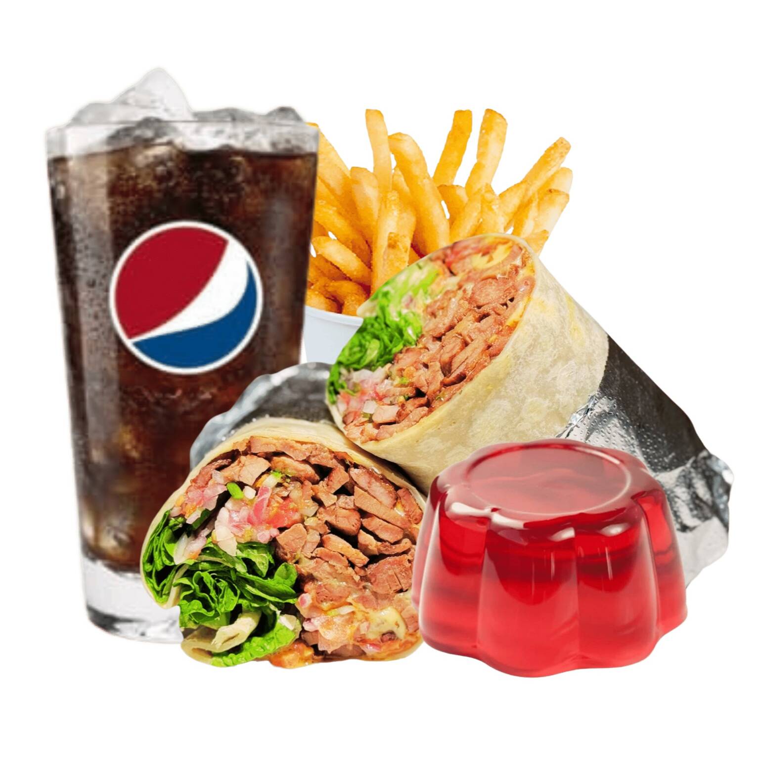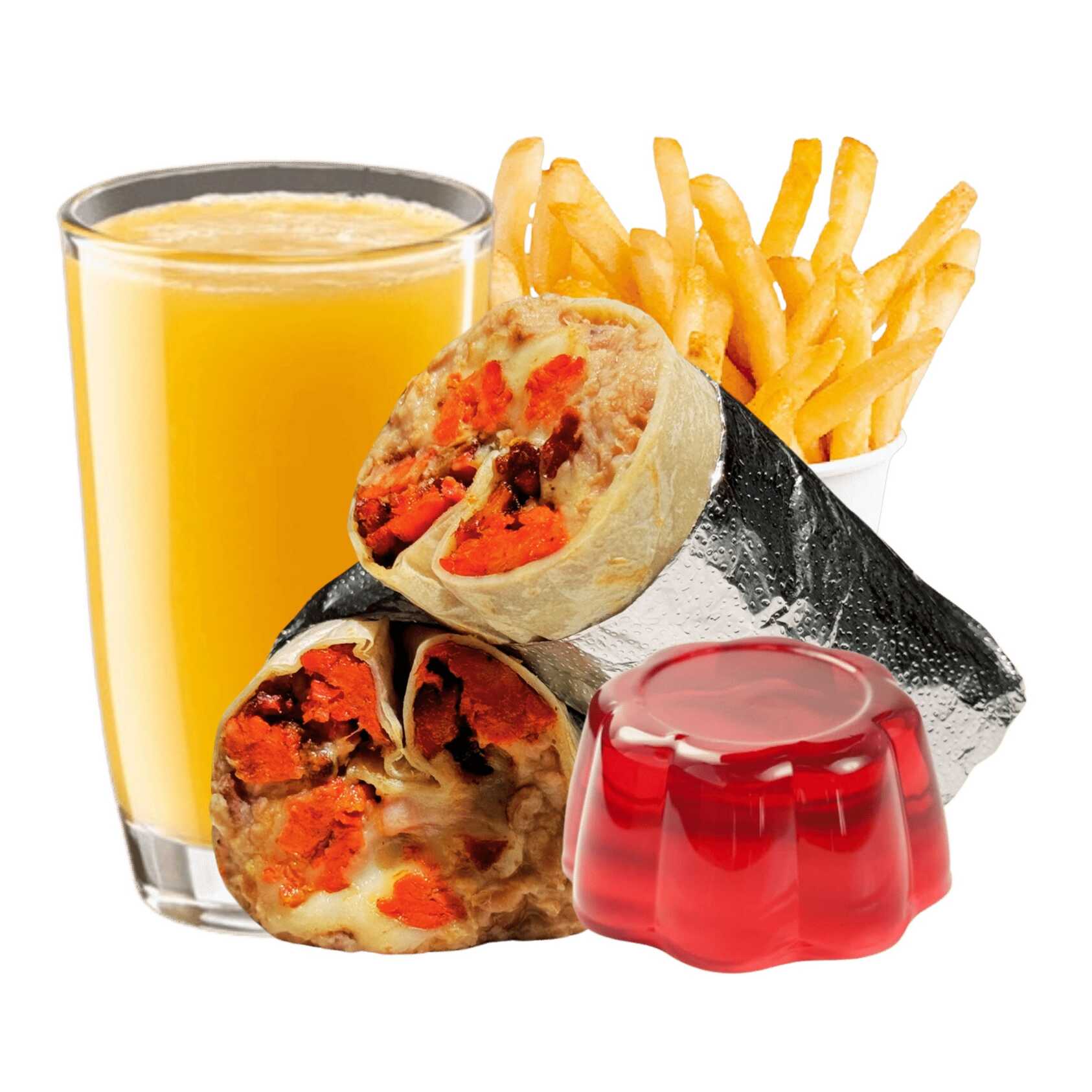 Burrito de tortilla de harina extra grandBurrito de tortilla de harina extra grande de 30 cm partido a la mitad con chorizo, queso manchego, frijoles fritos, salsa de tomate, postre y bebida a elegir.