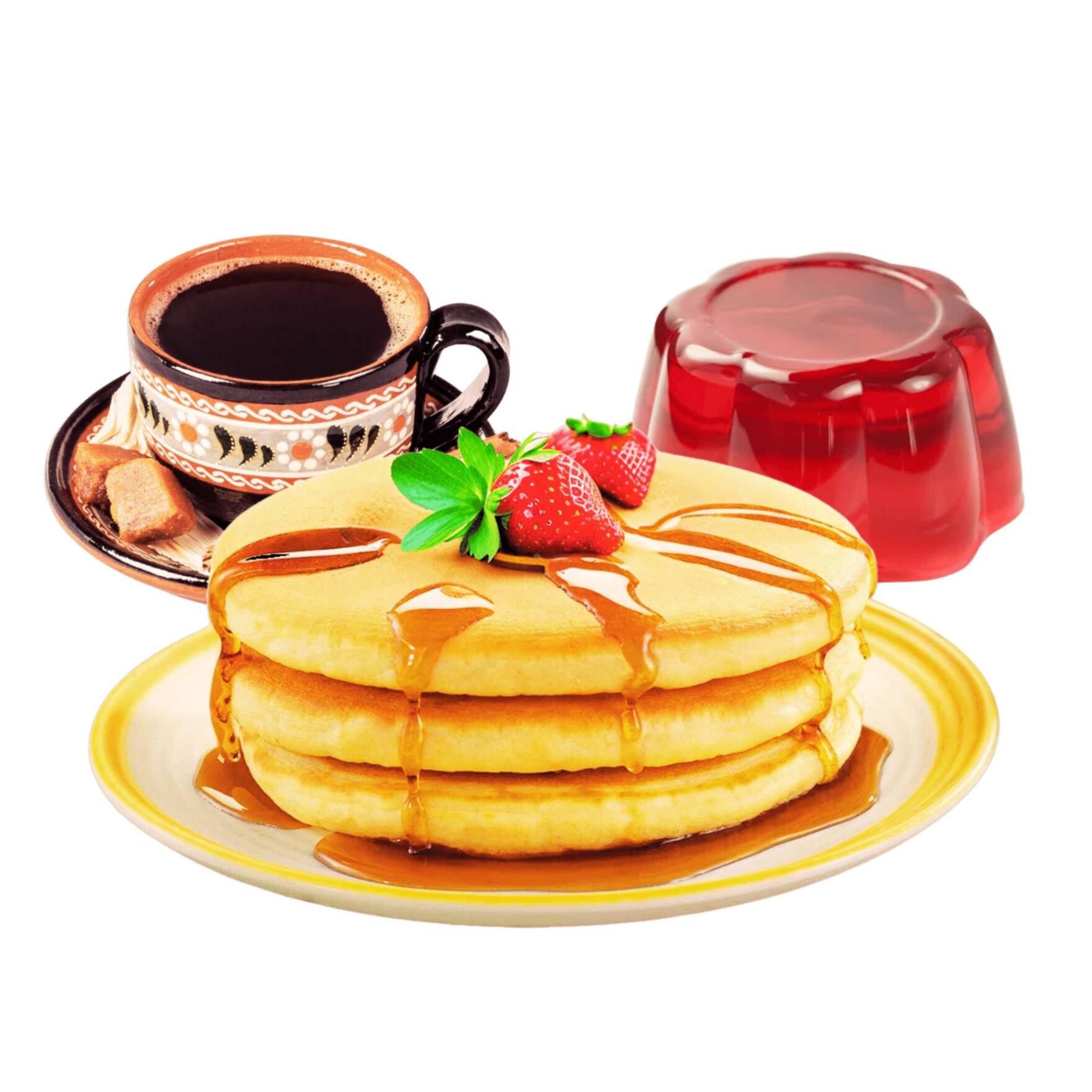 3 Piezas de Deliciosos Hotcakes preparados con Mantequilla, acompañados de Mermelada de Fresa y Miel de Maple con Bebida y Postre a Elegir.