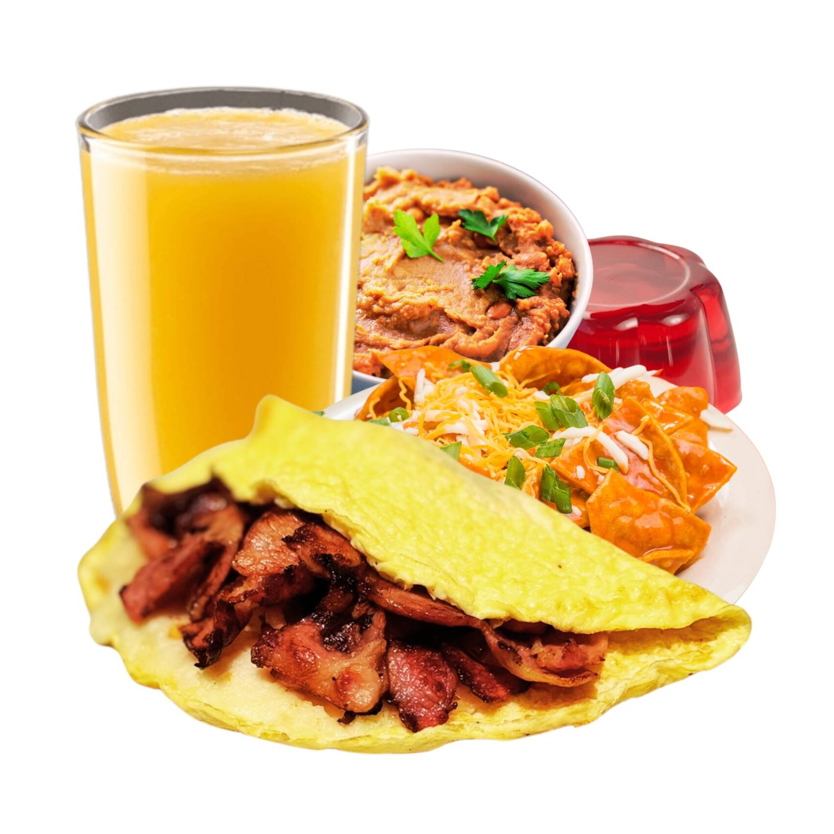 Tortilla de Huevo con Tocino y Queso Manchego acompañada de Chilaquiles Rojos, Frijoles Fritos con Postre y Bebida a Elegir.