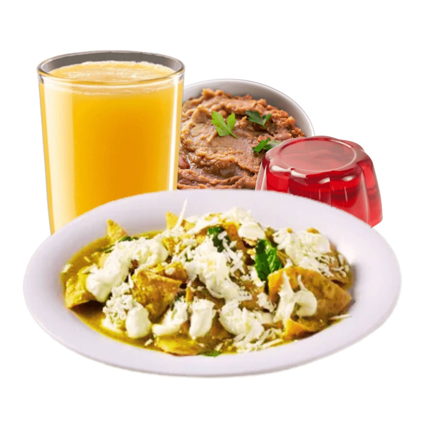 Chilaquiles Verdes con Pechuga de Pollo acompañados de Huevo Revuelto, Frijoles Fritos, Bolillo, Salsa de Tomate, Postre y Bebida a Elegir.