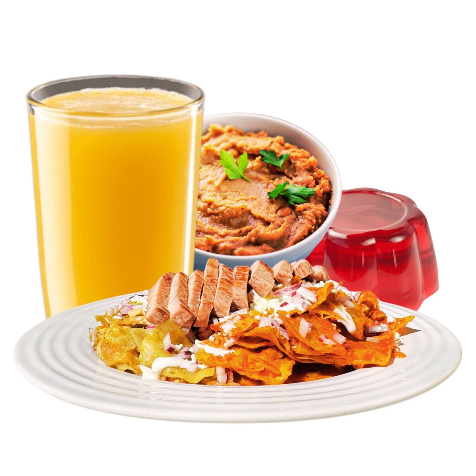 Chilaquiles Mixtos con Arrachera acompañados de Huevo Revuelto, Frijoles Fritos, Bolillo, Salsa de Tomate, Postre y Bebida a Elegir.
