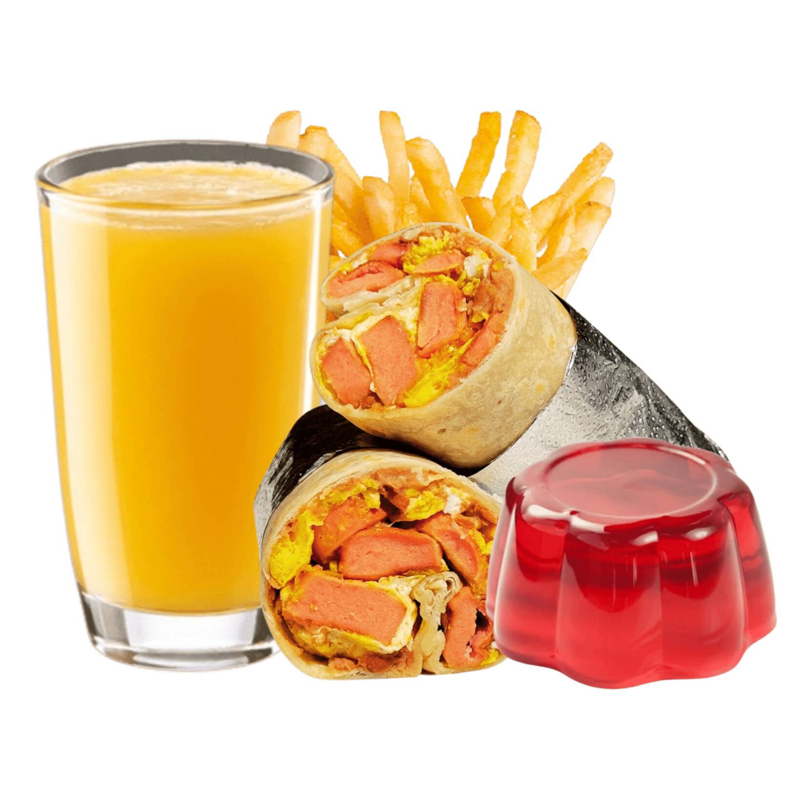 Burrito de tortilla de harina extra grande de 30 cm partido a la mitad con huevo revuelto con salchicha, jitomate, cebolla, cilantro y frijoles fritos, salsa de tomate, postre y bebida a elegir.