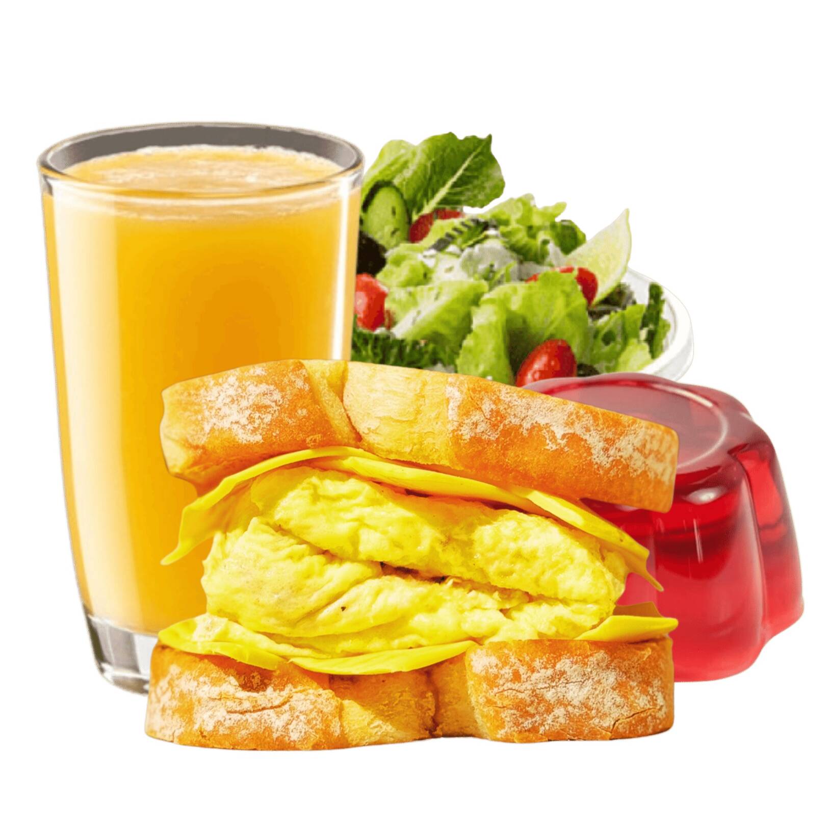 Sandwich de Pan Artesanal con Huevo Revuelto, Queso Cheddar acompañado de Guarnición, Catsup, Postre y Bebida a Elegir.