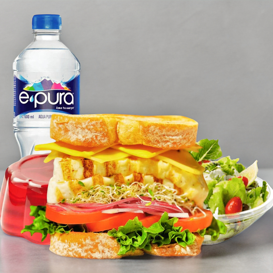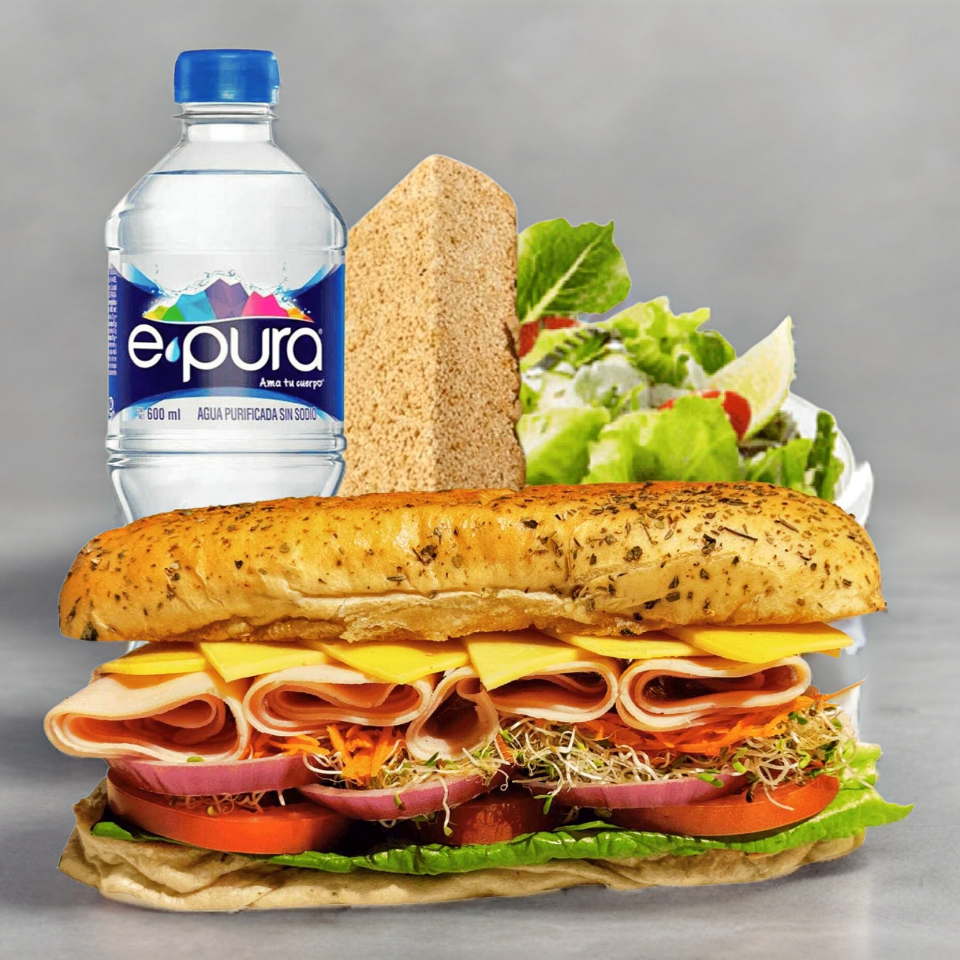 Delicioso Combo con Pan Multigrano acompañado con Guarnición, Bebida y Postre Favoritos.