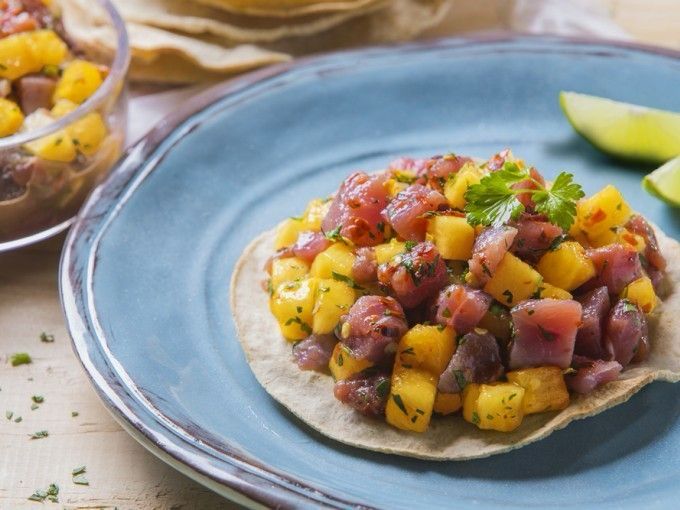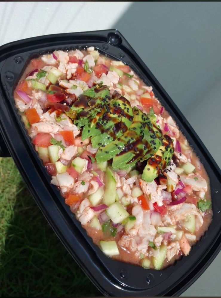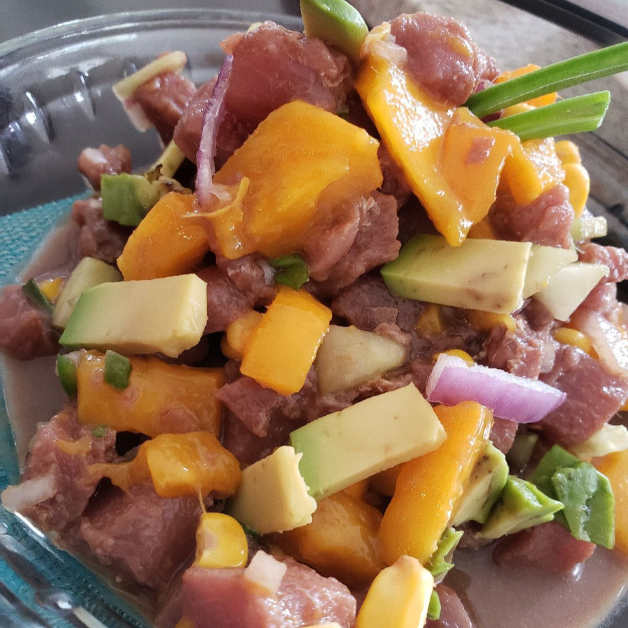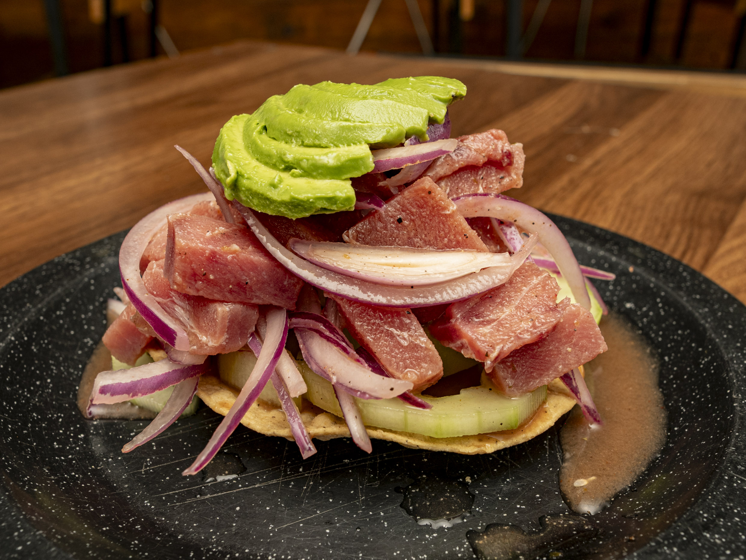 Trozos de atún curtidos, cebolla, pepino, mango o coco natural, por temporada macerado en salsas y aguacate.