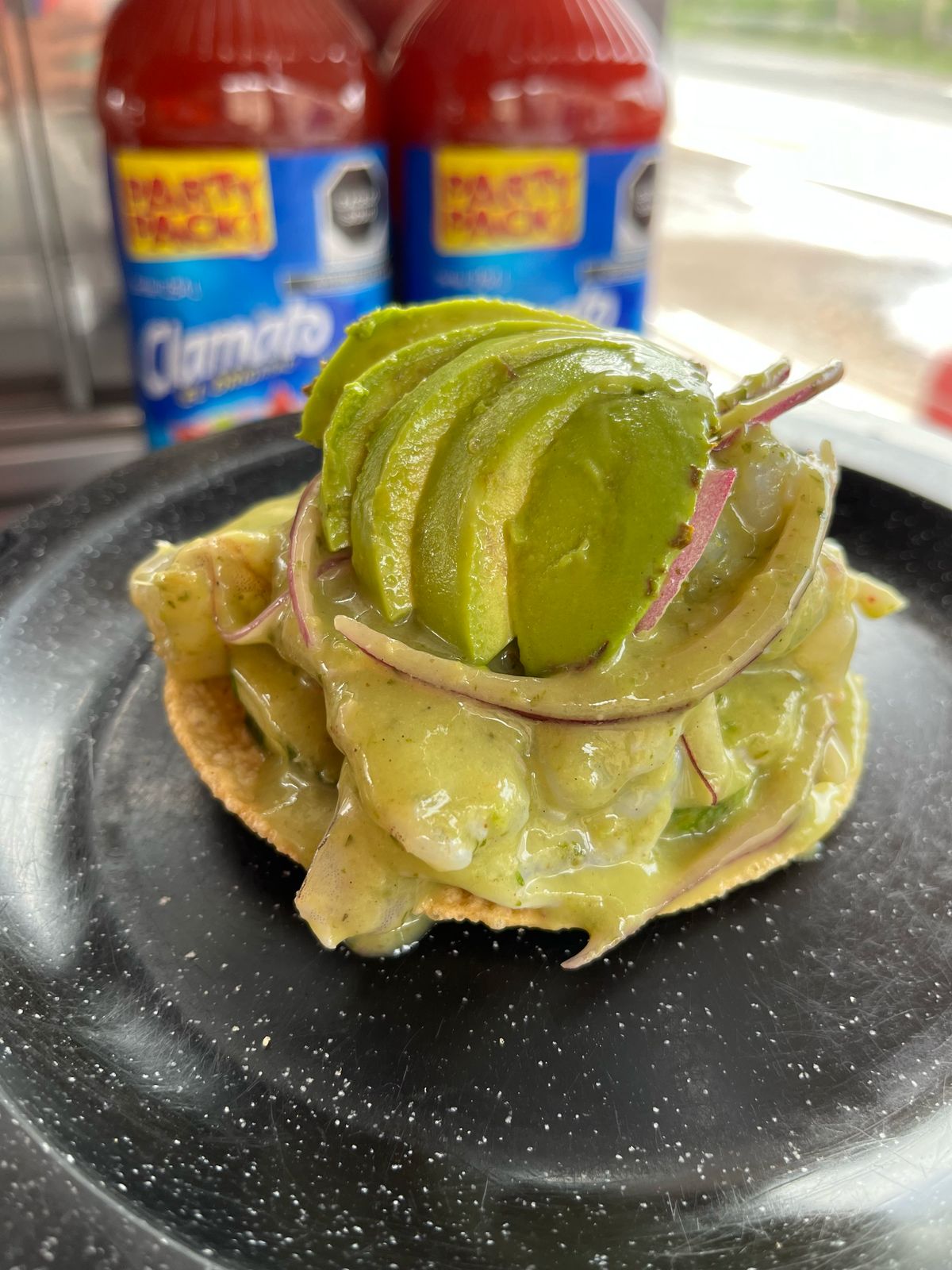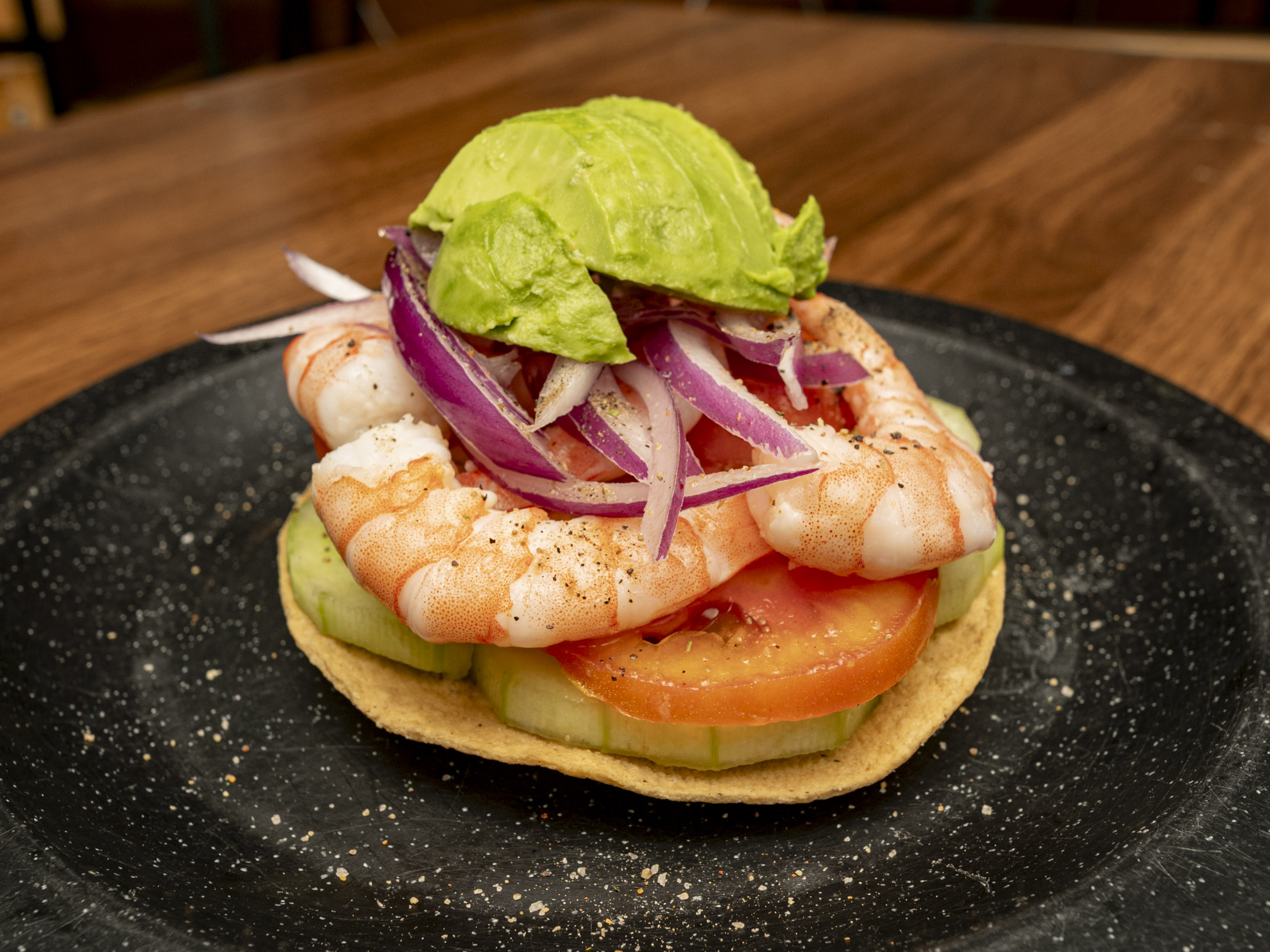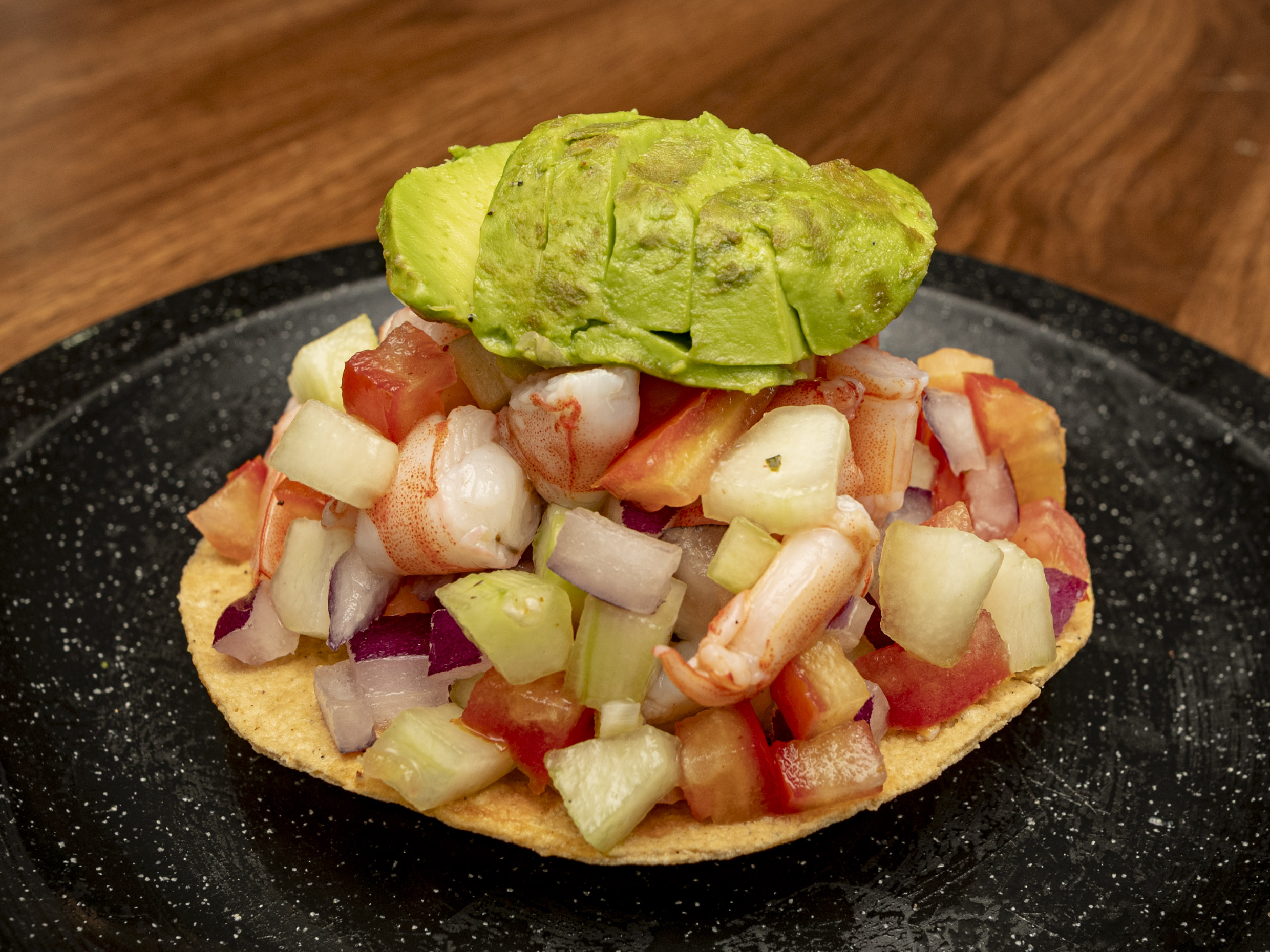 Camarón, pico de gallo marinado en salsas de la casa y coronado de aguacate.
