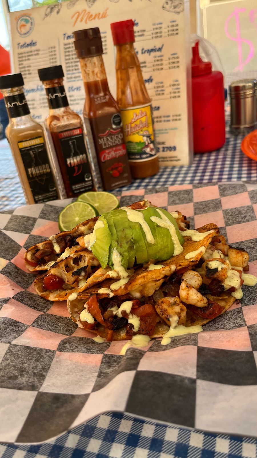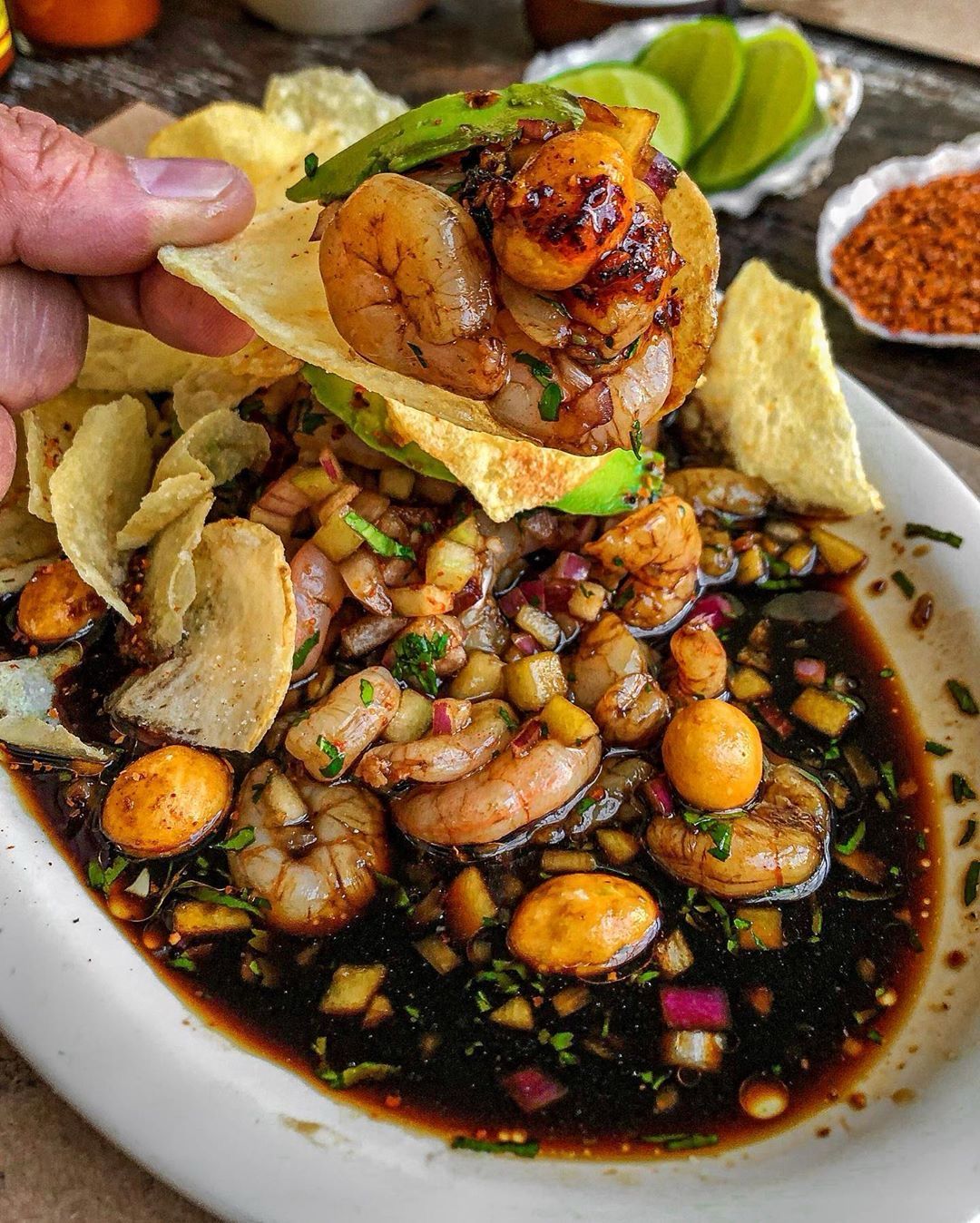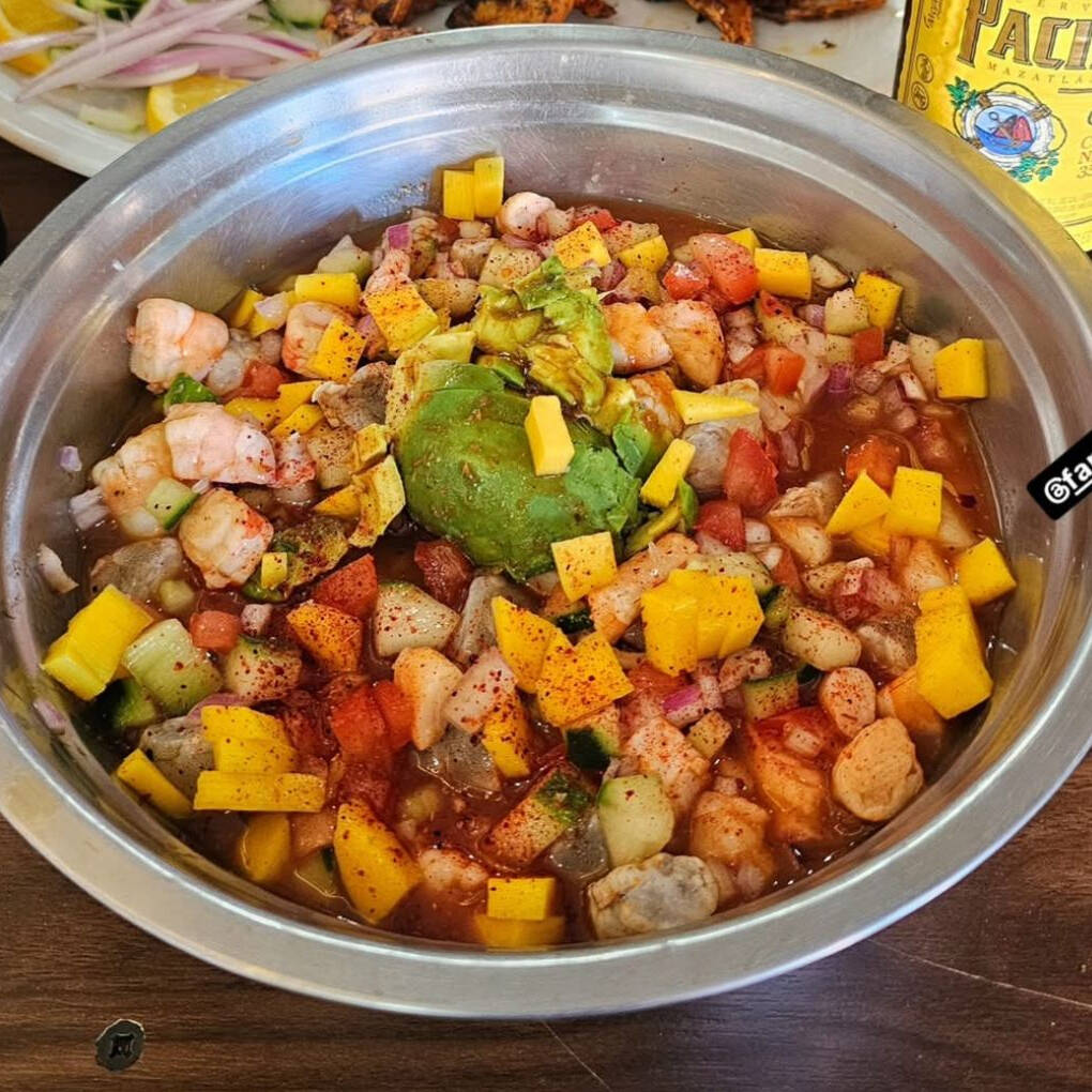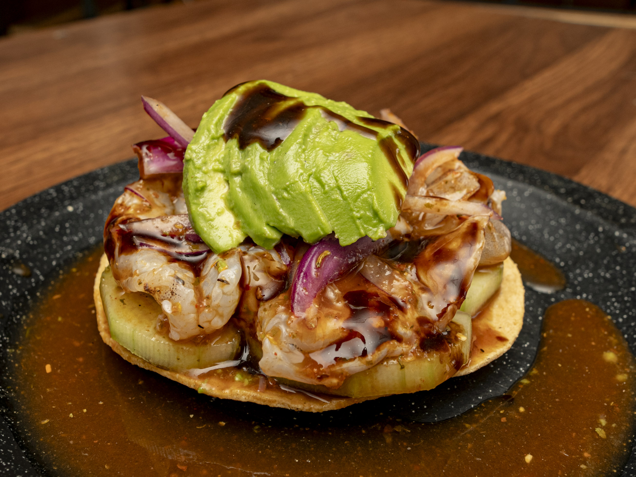 Camarón, pico de gallo marinado en salsas de la casa y coronado de aguacate.