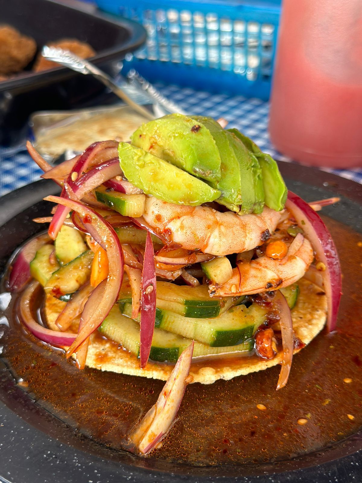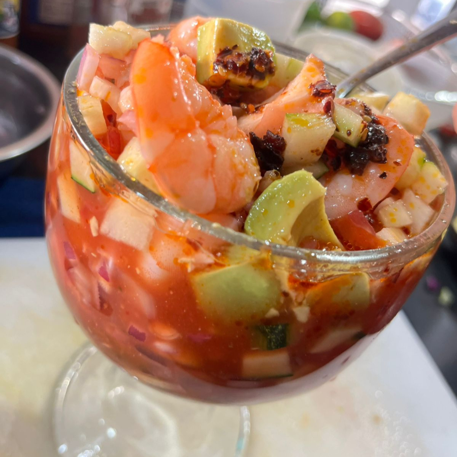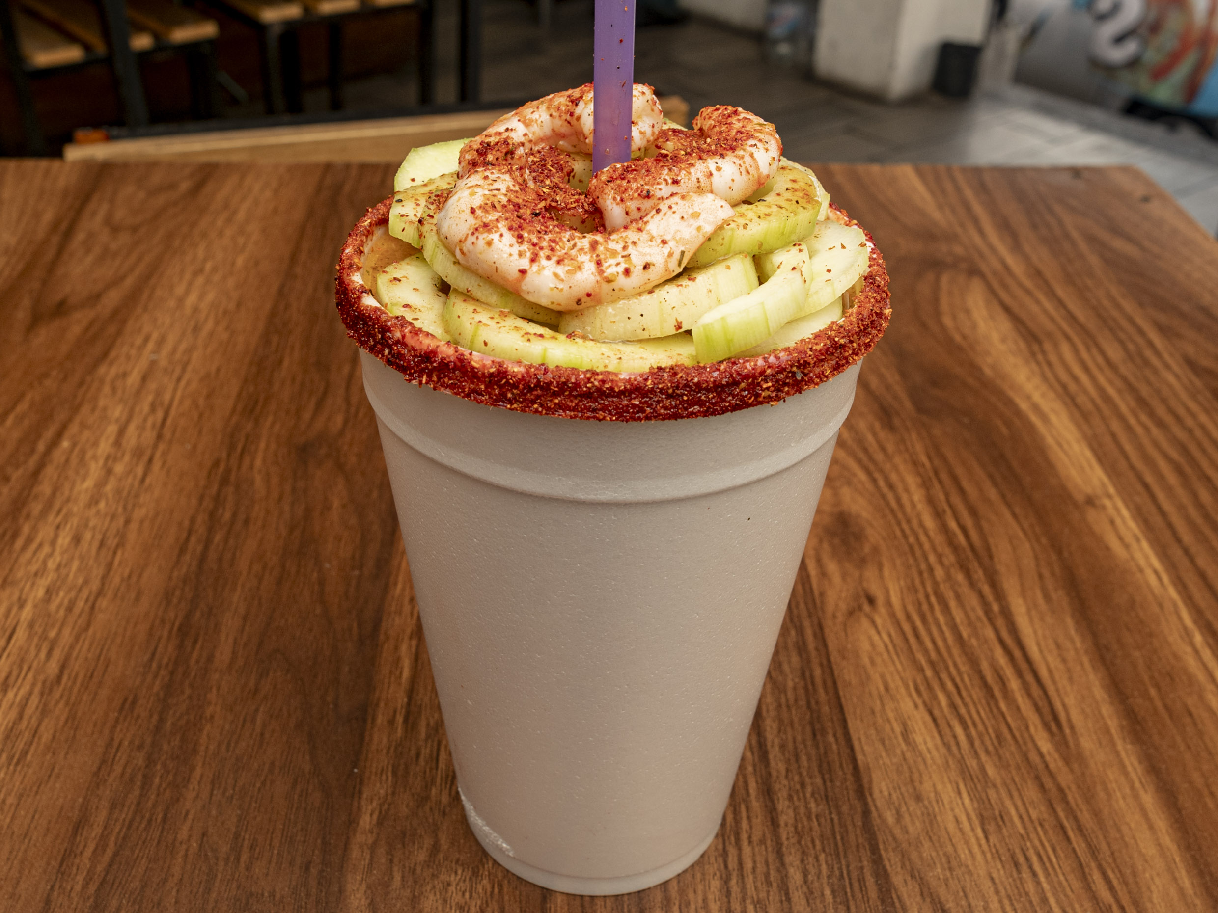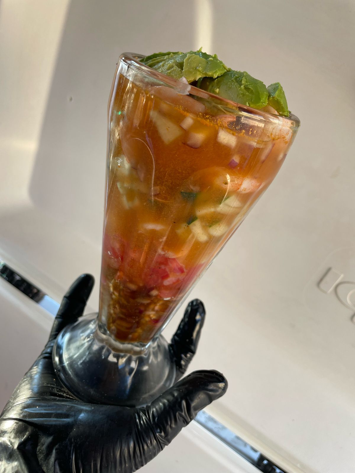 Camarón, pepino, cebolla, con un toque especial de salsa macha y clamato.