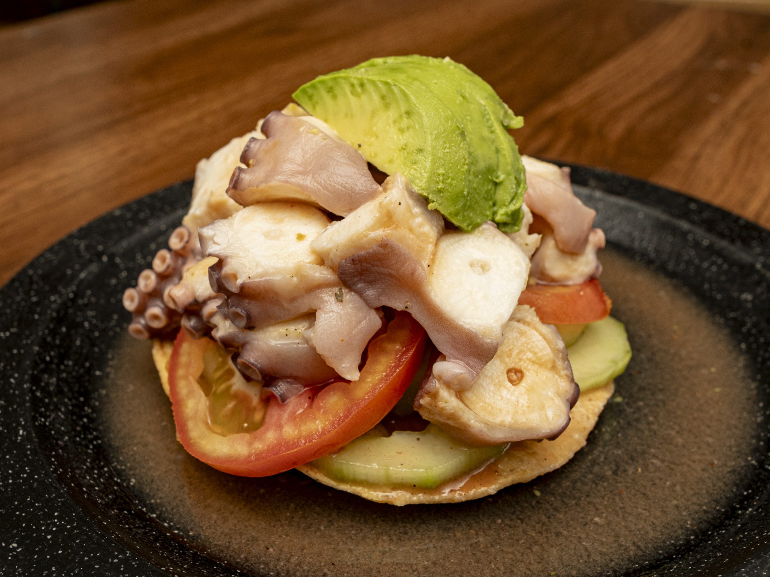 Trozos de camarón curtido, cocido y Pulpo, jitomate, cebolla, pepino, macerado en salsas y un toque de salsa macha de la casa.