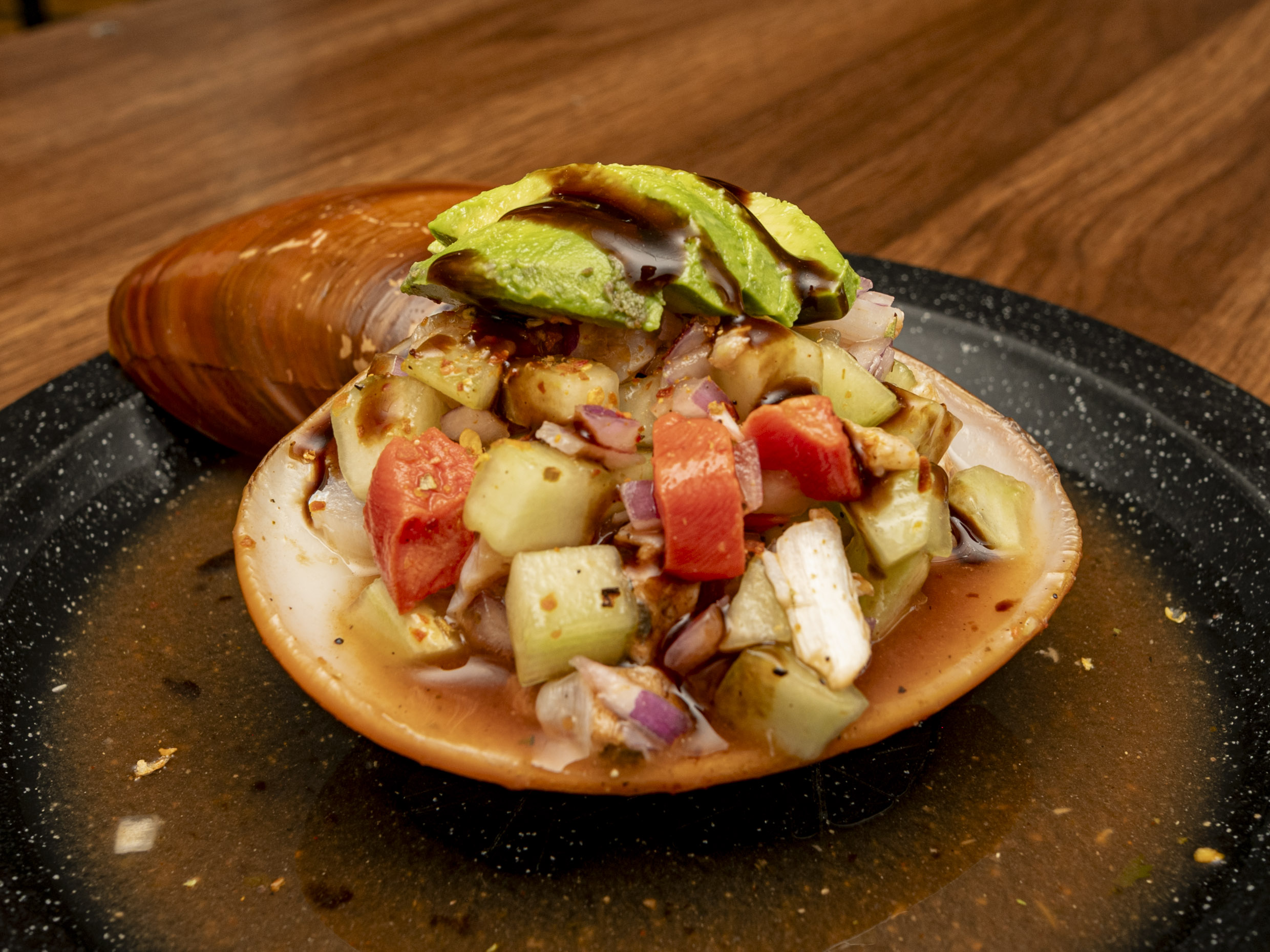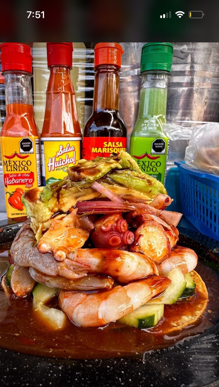 1 Pza, almeja picada, camarón picado, salsa a la mexicana, bañada en una de nuestras salsas, coronada con chiltepín.