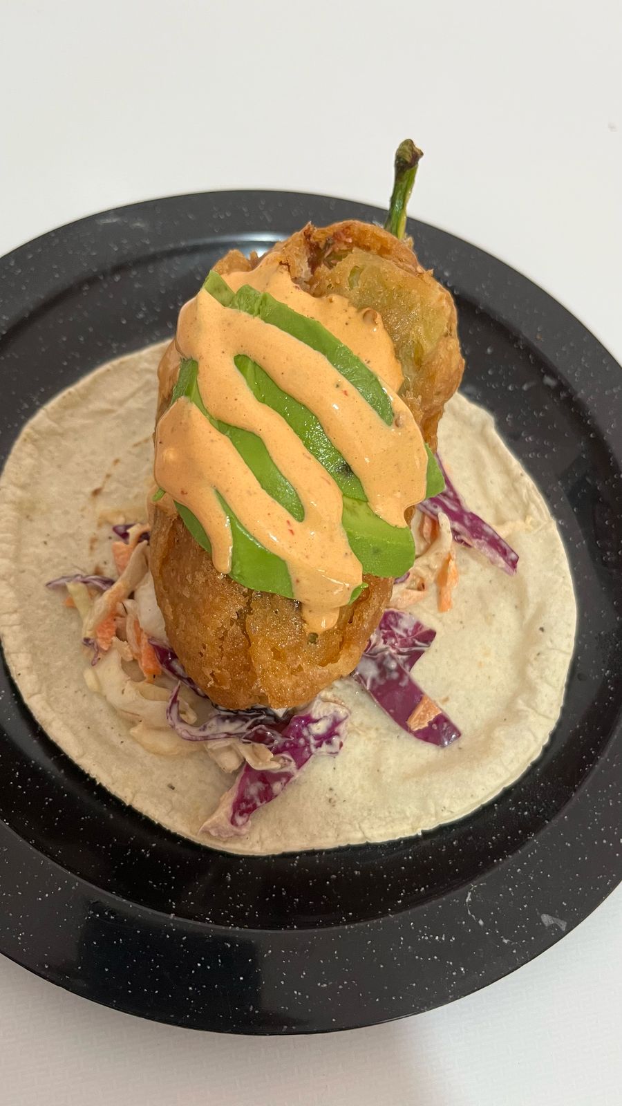 Chile guero puede ser relleno de camarón, marlin o jaiba con queso fundido y capeado.