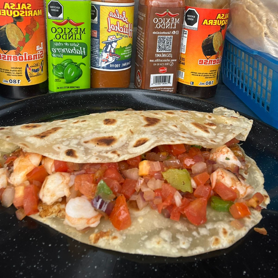 Deliciosa quesadilla con tortilla de harina, el marisco de tu elección es guisado con jitomate,cebolla y queso fundido