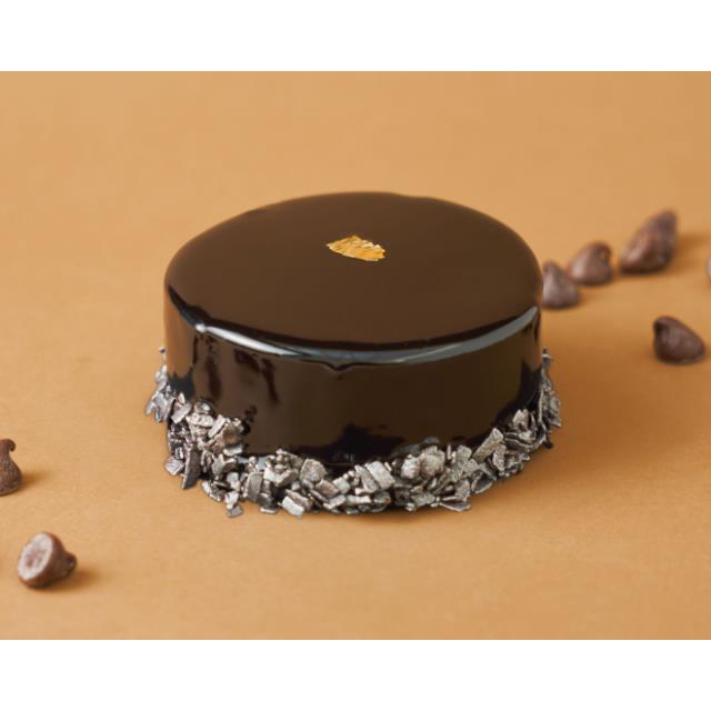 Pastelito de chocolate amargo con una base de praliné crujiente de avellana, mousse de chocolate blanco, terminado con un glaseado de cocoa.