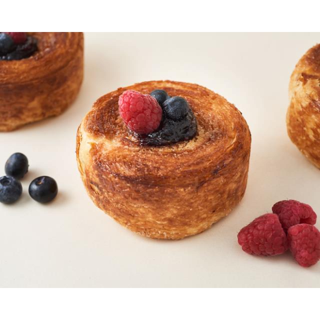 Pan de masa dulce caramelizada elaborada a base de mantequilla y azúcar, con un relleno de frutos rojos.