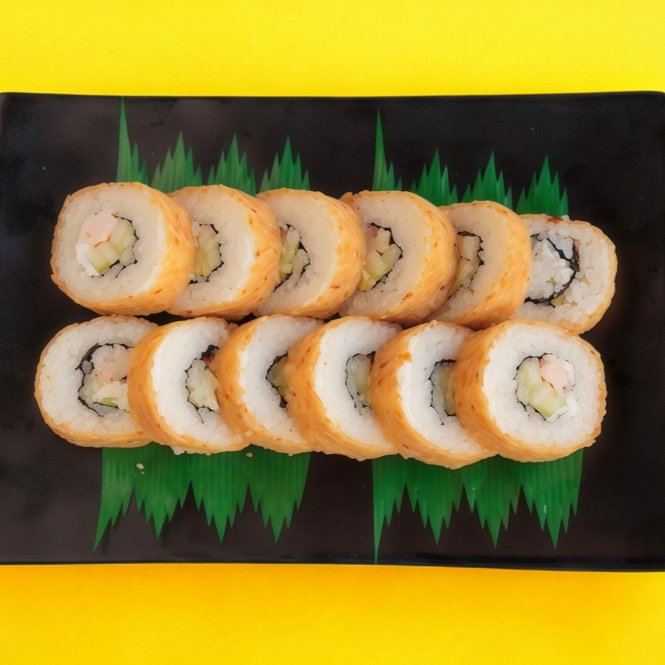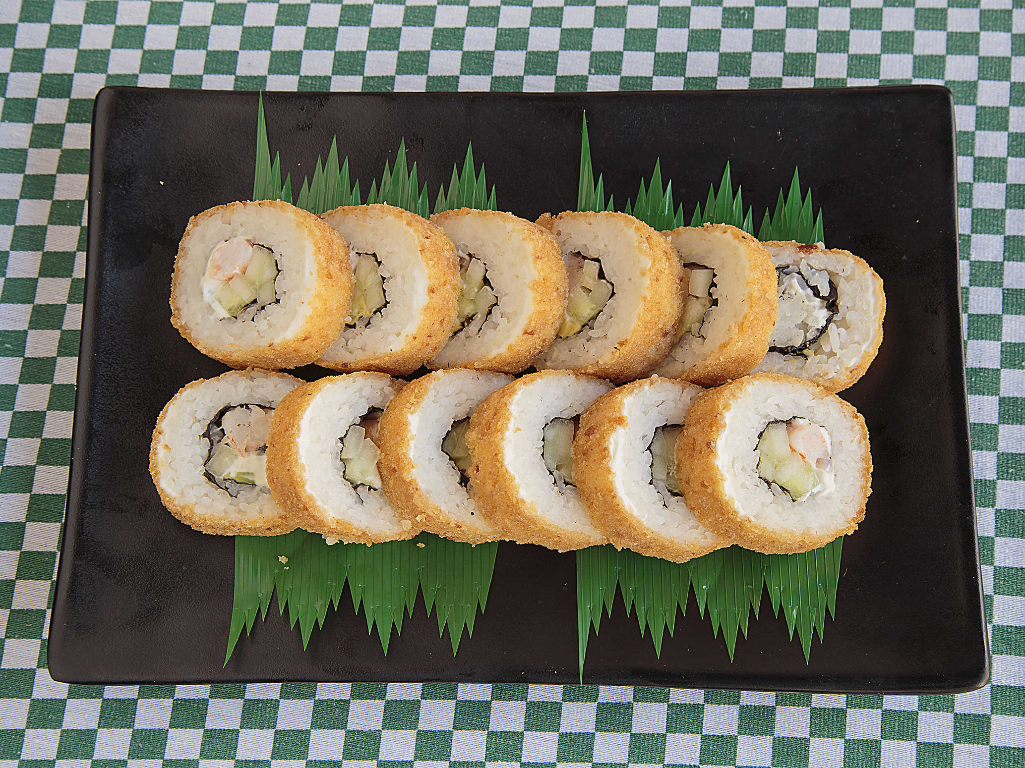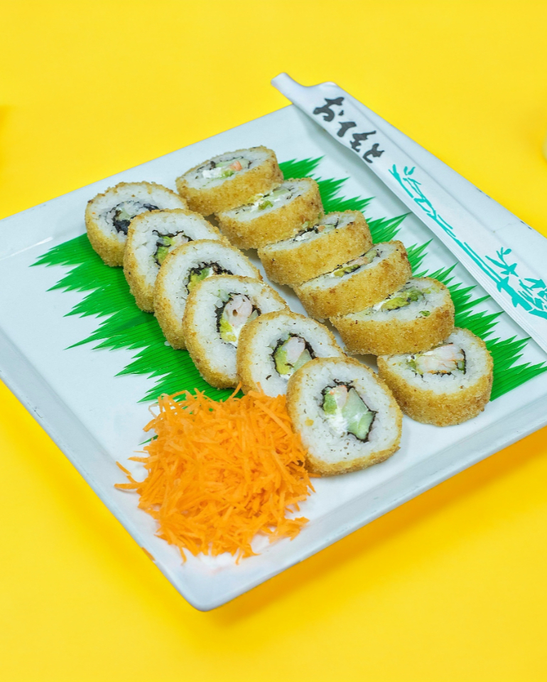Sushi empanizado, relleno de philadelphia, aguacate, pepino, camaron y arrachera.
