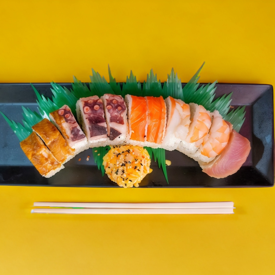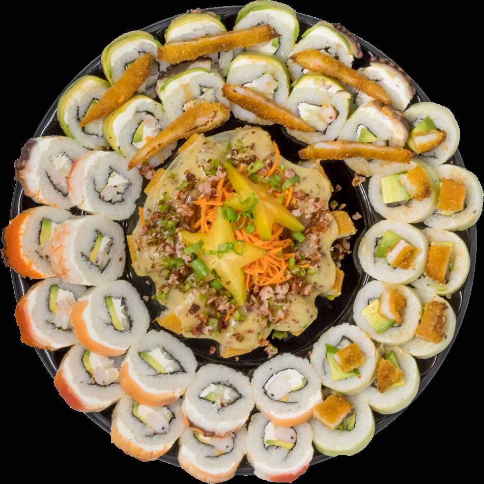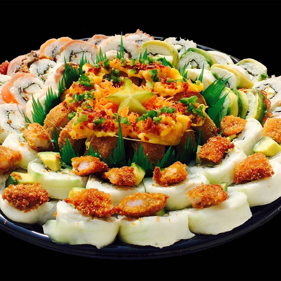 48 piezas (aprox) Ideal para compartir en familia. 4 rollos especiales. (Arcoiris - Gratinado Roll - Chesee ushi - Samurai Roll