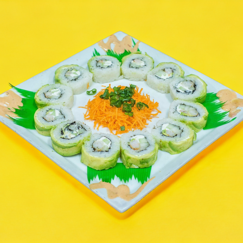 Delicioso Sushi forrado de aguacate, relleno de pepino, aguacate, philadelphia y proteina a elegir.
