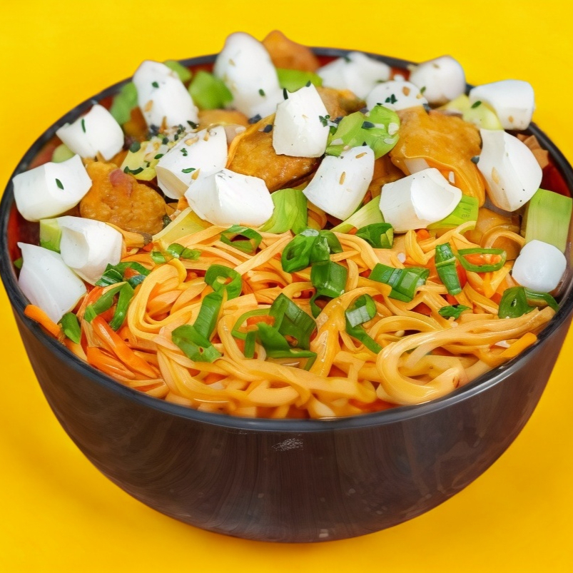 Combinación de verdura, con pasta udon, a la plancha compuesta de zanahoria, col morada calabaza, champiñon, pimiento rojo, germinado de soya, cebollin y aguacate