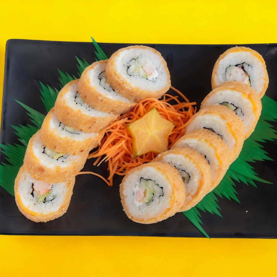 Sushi Empanizado, forrado con queso philadelphia, queso manchego y queso amarillo, relleno de pepino, aguacate, philadelphia y proteina a elegir.